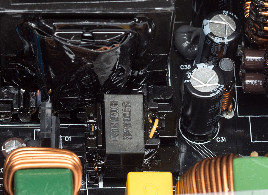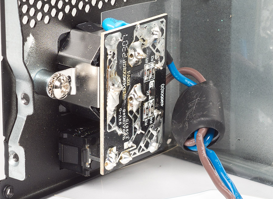 Частина елементів фільтра імпульсних перешкод встановлені на окремій платі, припаяної до роз'єму, інші елементи фільтра розпаяні на основній платі блоку.