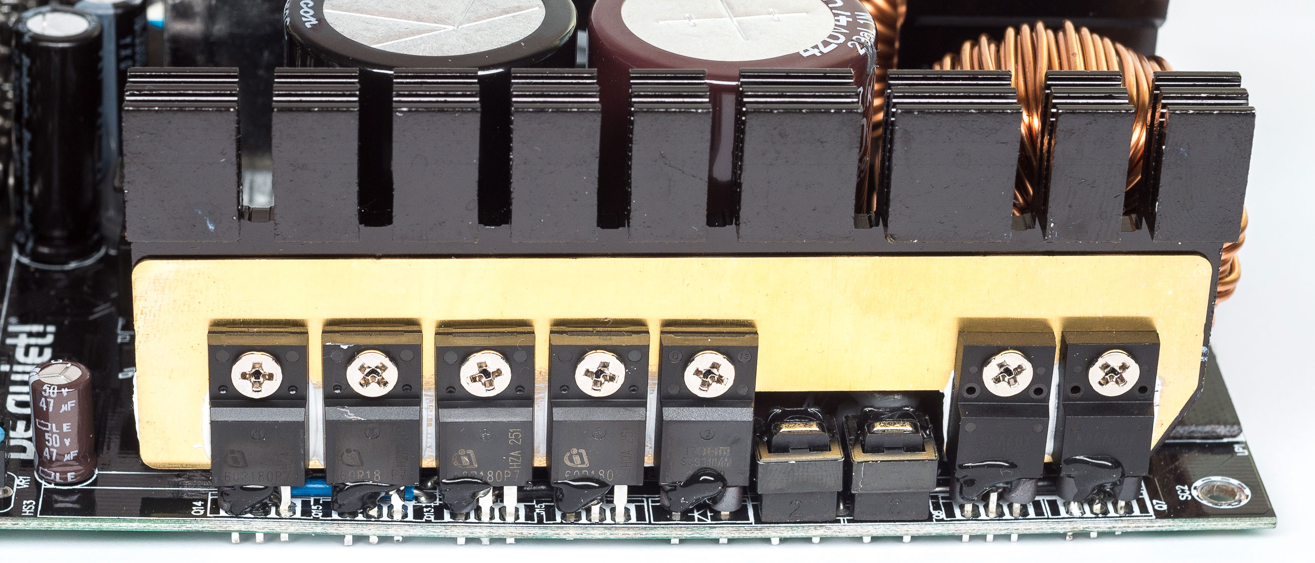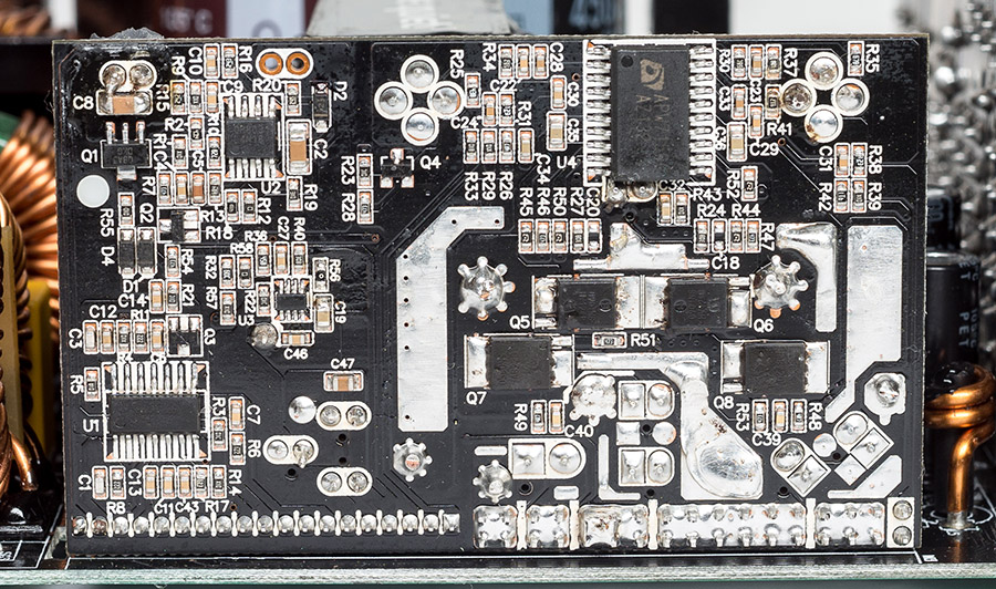Синхронний випрямляч виконано на шести транзисторах TPHR8504PL (150 А, 40, 0,7 мОм), розпаяних на основній платі. Поруч із транзисторами впаяно чотири мідні нікельовані пластини для їх охолодження, частина тепла від транзисторів передається на корпус через термопрокладки.
