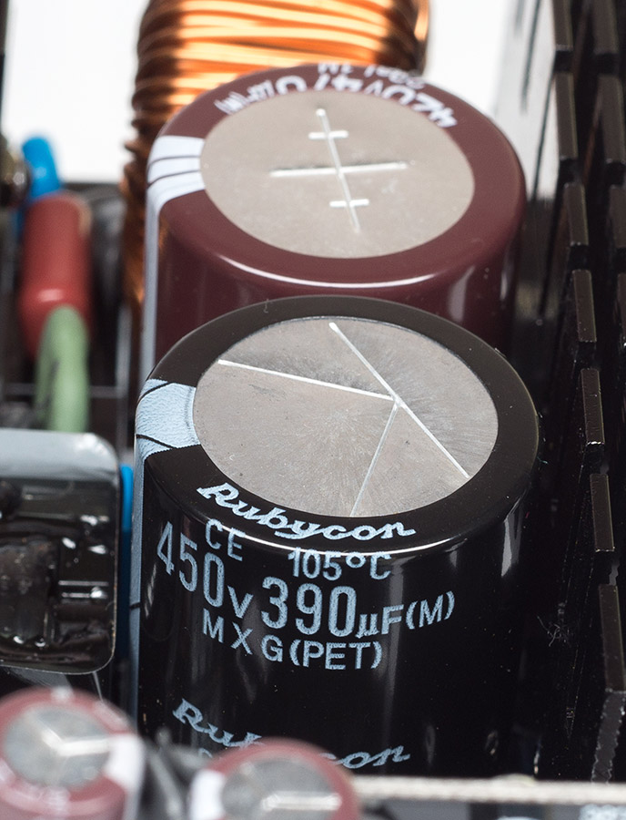 Високовольтний фільтр виконано на двох електролітичних конденсаторах, один ємністю 470 мкФ з робочою напругою 420 В та температурою 105 °C виробництва Nippon Chemi-Con, другий вже ємністю 390 мкФ з напругою 450 В та 105 °C виробництва Rubycon. Загальна ємність фільтра становить 860 мкФ.