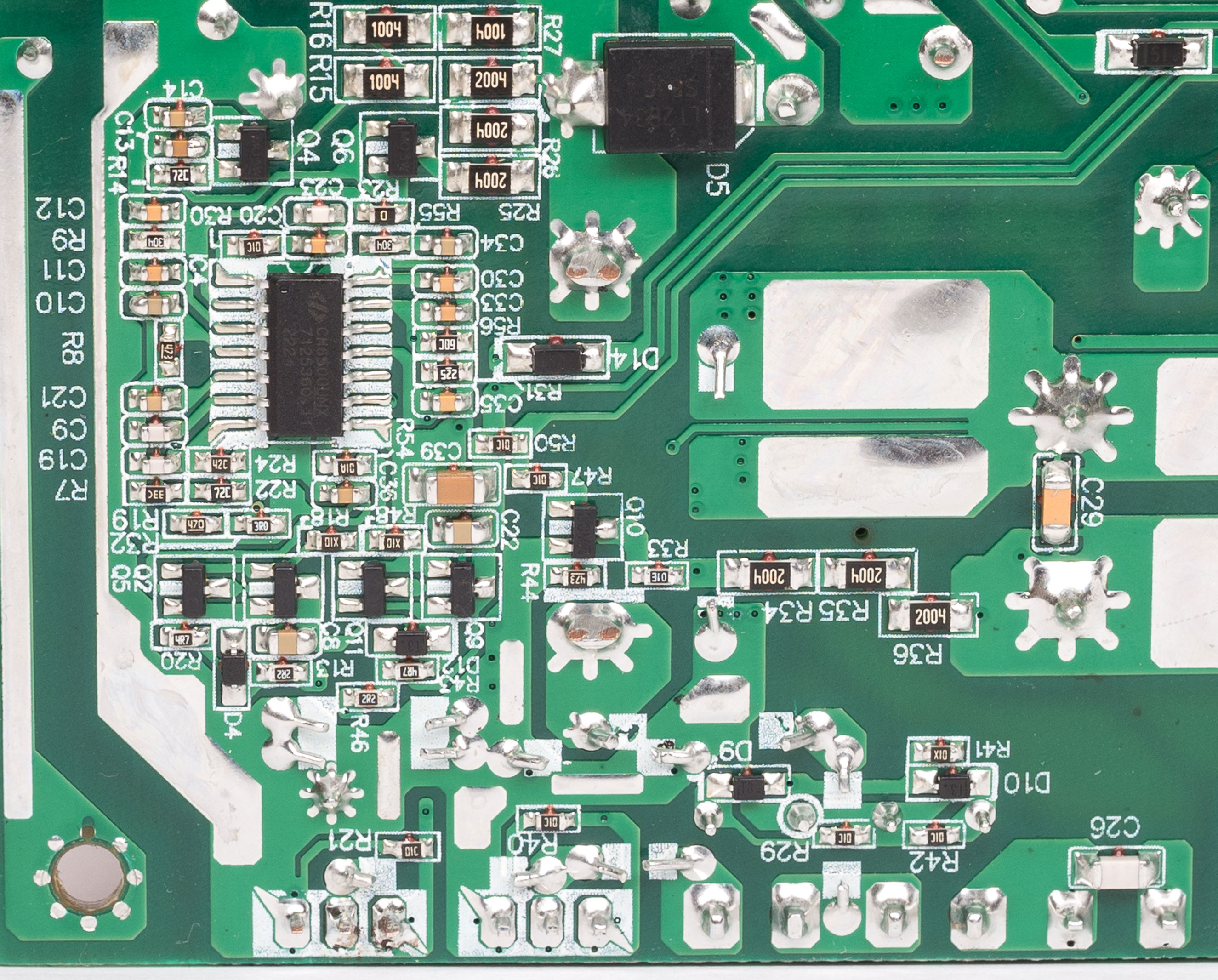 У силовій частині коректора встановлені пара транзисторів з маркуванням K25A65X (25 А, 650 В), включених паралельно, і діод SCS310AM (10 А, 650 В).