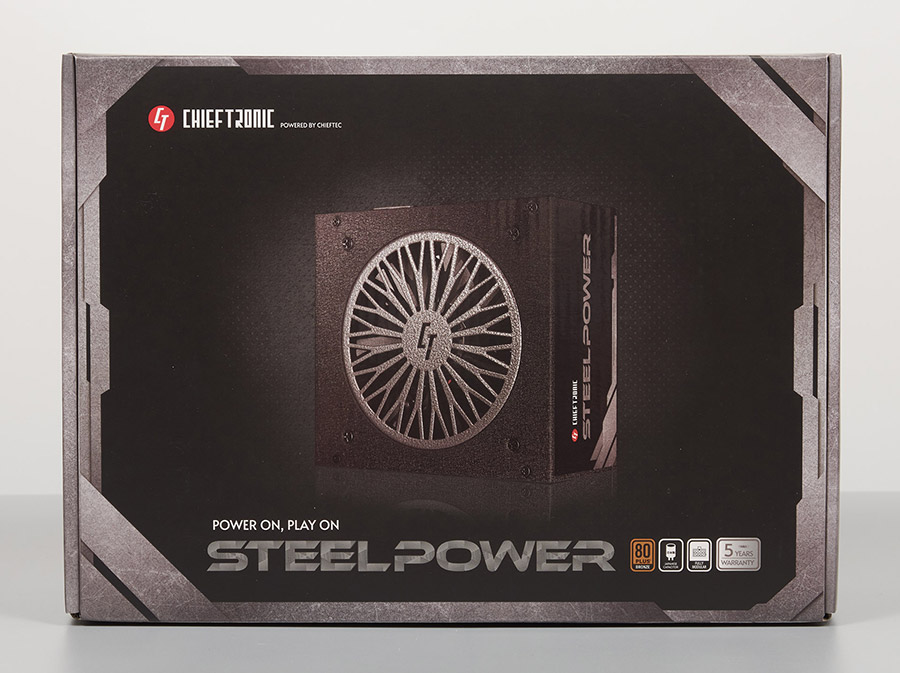 Блок живлення постачається в коробці середніх розмірів із якісною поліграфією, яка використовується для всіх продуктів цієї серії. На передній грані розташоване фото блоку, на задній — інформація про технічні характеристики всіх пристроїв лінійки SteelPower.