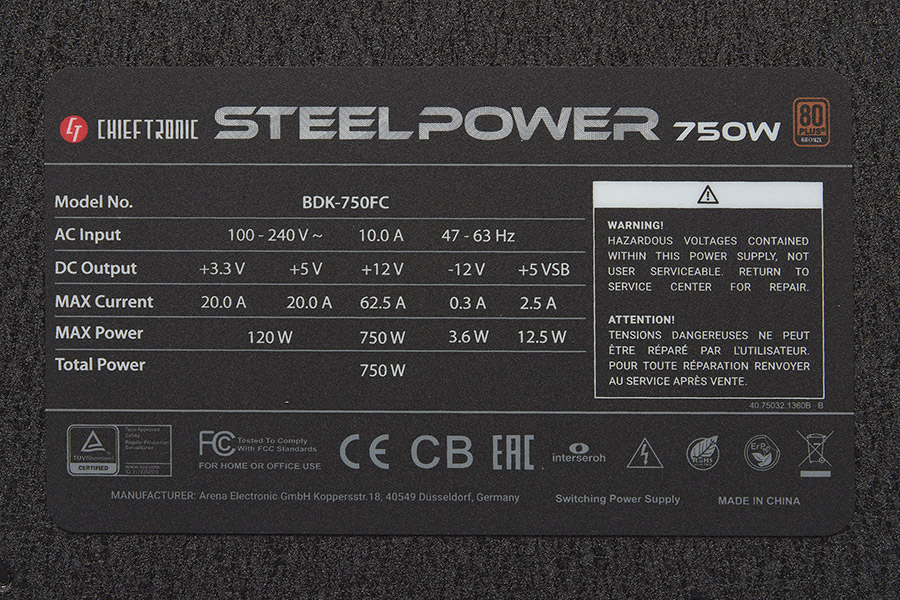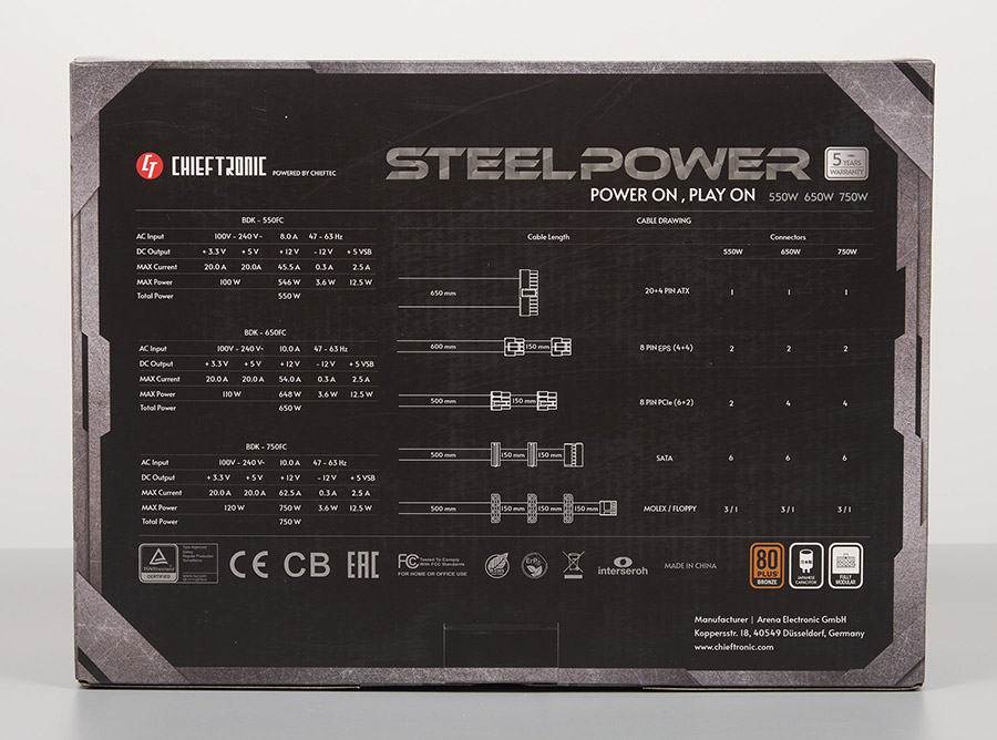 Сьогодні у нас на тесті блок живлення Chieftronic BDK-750FC — старша модель із серії SteelPower, у якій також є моделі на 550 та 650 ватів. Всі вони мають сертифікат 80 Plus Bronze. Це відносно бюджетна серія з модульним підключенням кабелів, резонансним LLC-перетворювачем із синхронним випрямлячем та незалежною стабілізацією вихідної напруги. Також виробник обіцяє преміальні японські конденсатори. Оцінимо наскільки він добрий.