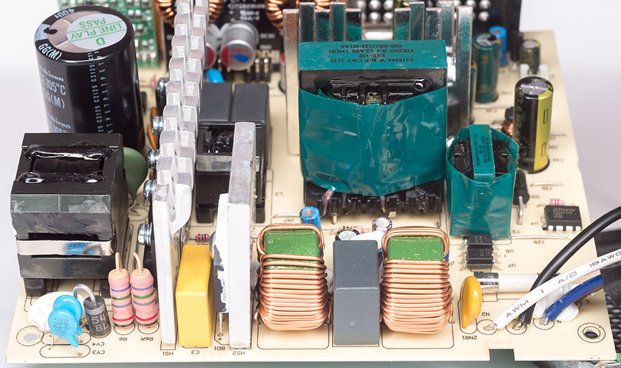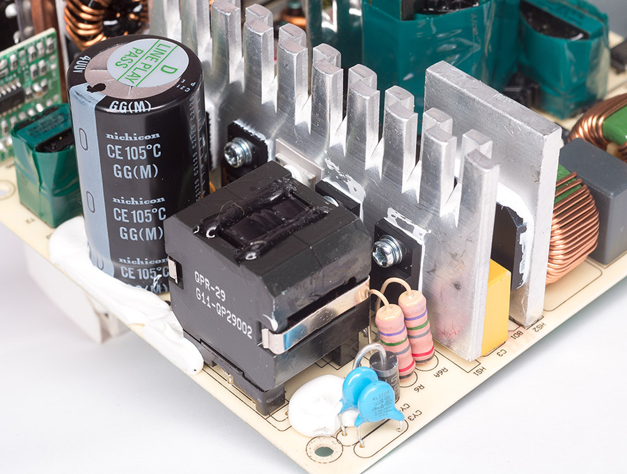 Пара силових транзисторів PTA20N50A (20 А, 500 В) резонансного LLC-перетворювача встановлені на загальний радіатор з елементами APFC, керує перетворювачем мікросхема CM6901X, яка розташована на окремій маленькій платі. Синхронний випрямляч виконаний на чотирьох транзисторах AP4N2R6 (150 А, 40, 2,6 мОм), які розпаяні на основній платі, за їх охолодження відповідають дві пластини, впаяні поруч. Вихідну напругу фільтрують шість полімерних конденсаторів номіналом 470 мкФ 16 В і електролітичний конденсатор з характеристиками 3300 мкФ 16 В 105 °C виробництва ChengX.