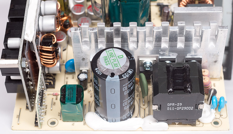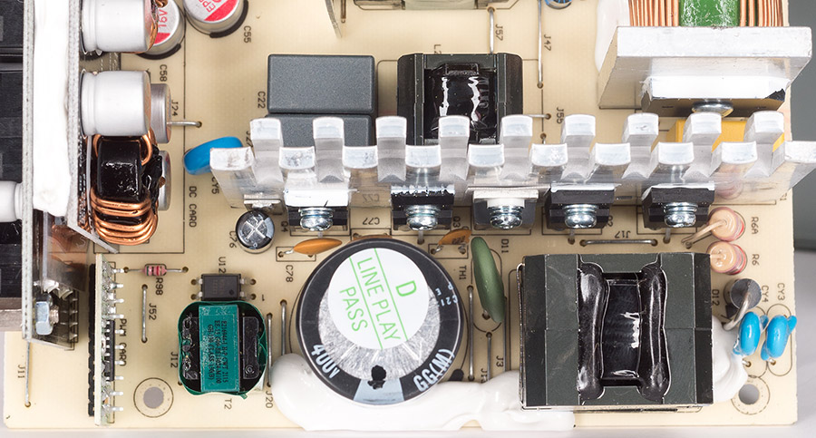 На вході розпаяно повноцінний фільтр імпульсних перешкод, частина його елементів знаходиться на мережевому роз'ємі. Вхідний випрямляч охолоджується невеликим окремим радіатором, коректором коефіцієнта потужності керує мікросхема CM6500UNX. Високовольтний фільтр виконаний на електролітичному конденсаторі ємністю 390 мкФ і напругою 400 В з робочою температурою 105 °C виробництва фірми Nichicon.