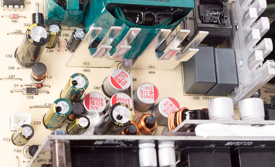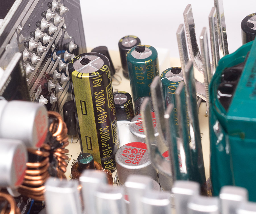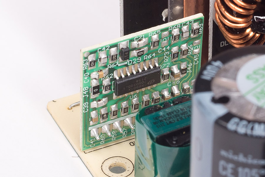 На платі підключення модульних кабелів встановлені полімерні конденсатори для додаткової фільтрації вихідних напруг: шість на 470 мкФ 16 В і сім на 560 мкФ 6,3 В.