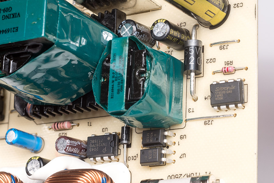 Перетворювач живлення режиму очікування виконаний на ШІМ-контролері TNY287PG, на його виході встановлений електролітичний Low ESR конденсатор ємністю 2200 мкФ та напругою 10 В з робочою температурою 105 °C виробництва ChengX. Всі інші конденсатори в блоці також від ChengX та CapXon. Стежить за вихідною напругою супервізор ST9S313-DAG від Sitronix.