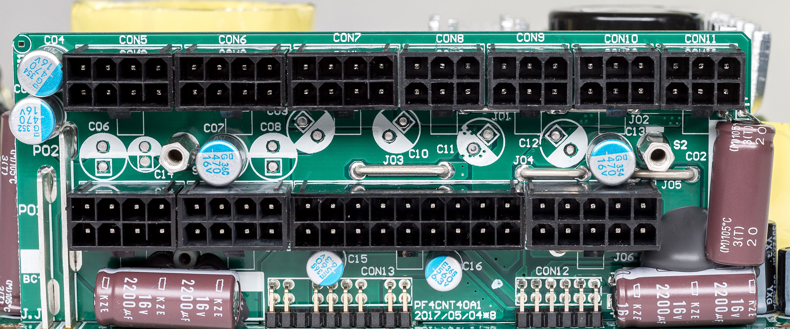 На платі під’єднання модульних кабелів для додаткової фільтрації лінії +12 В встановлено ще чотири полімерні конденсатори ємністю 470 мкФ і напругою 16 В, а також три електролітичні конденсатори ємністю 2200 мкФ і напругою 16 В на 105 °C виробництва Nippon Chemi-Con.