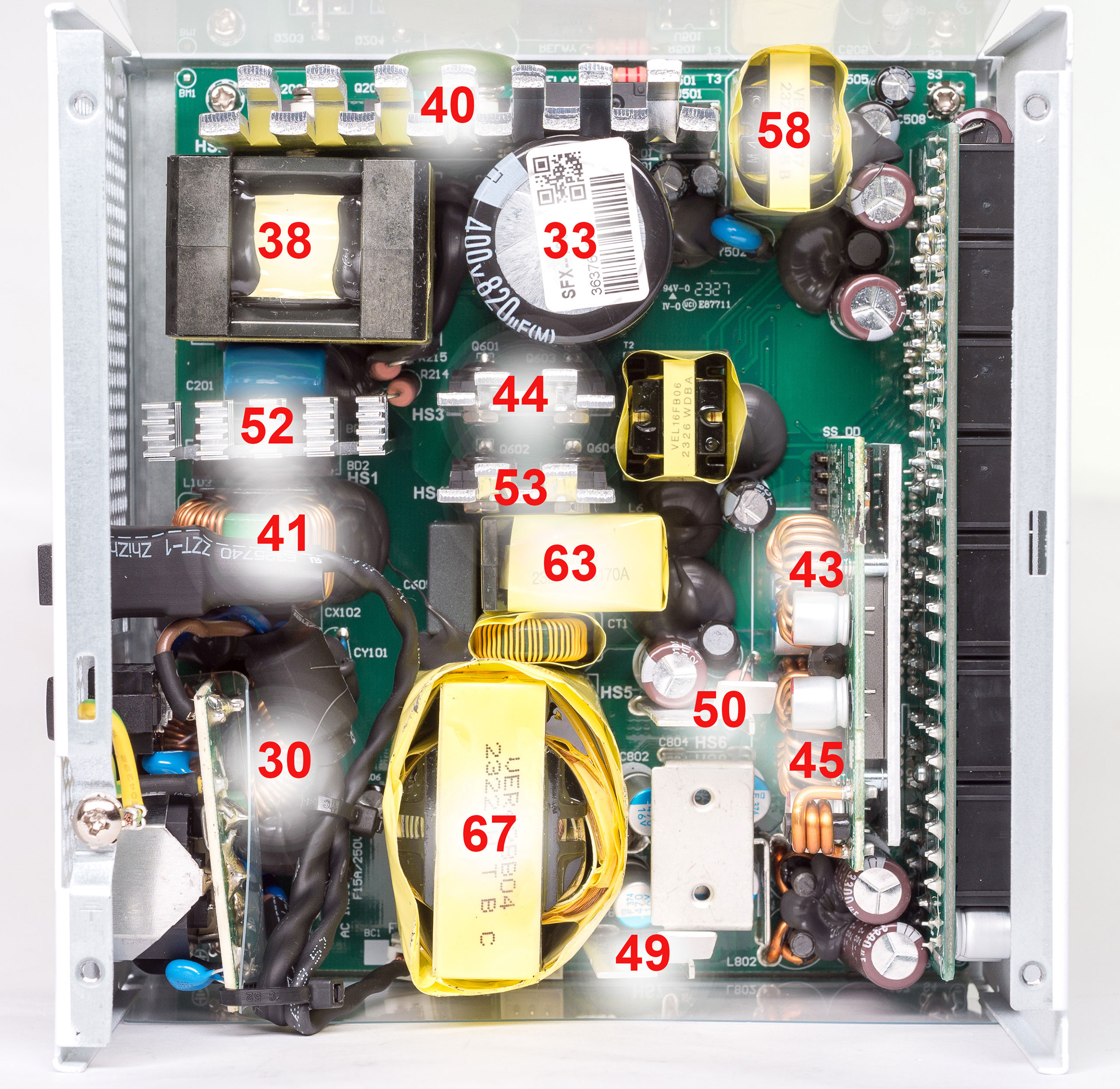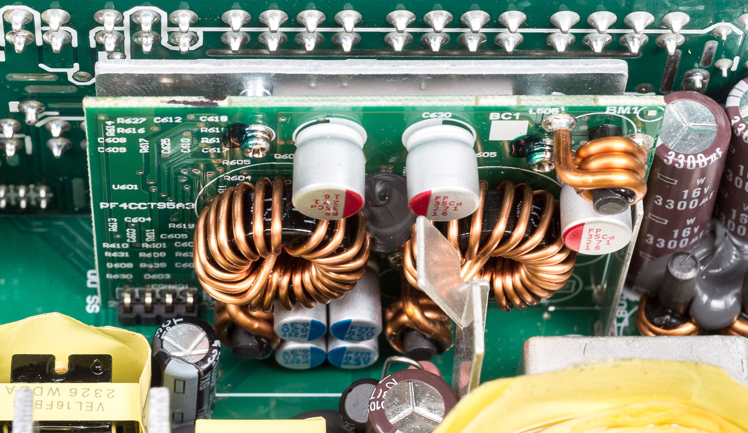 На вході блоку розпаяний фільтр другого порядку, частина його елементів встановлені на окремій платі, припаяній до мережевого роз’єму. Вхідний випрямляч складається з двох діодних збірок GBU1508 (15 А, 800 В), увімкнених паралельно і встановлених на невеликому радіаторі. Управляє APFC контролер CM6500UNX, розпаяний на основній платі. У силовій частині коректора встановлено пару транзисторів із маркуванням IPP60R125P6 (30 А, 650 В, 0,125 Ом), увімкнених паралельно, і діод C3D08060A (11 А, 600 В). Високовольтний фільтр виконано на електролітичному конденсаторі ємністю 820 мкФ і робочою напругою 400 В (105 °C) виробництва Rubycon.