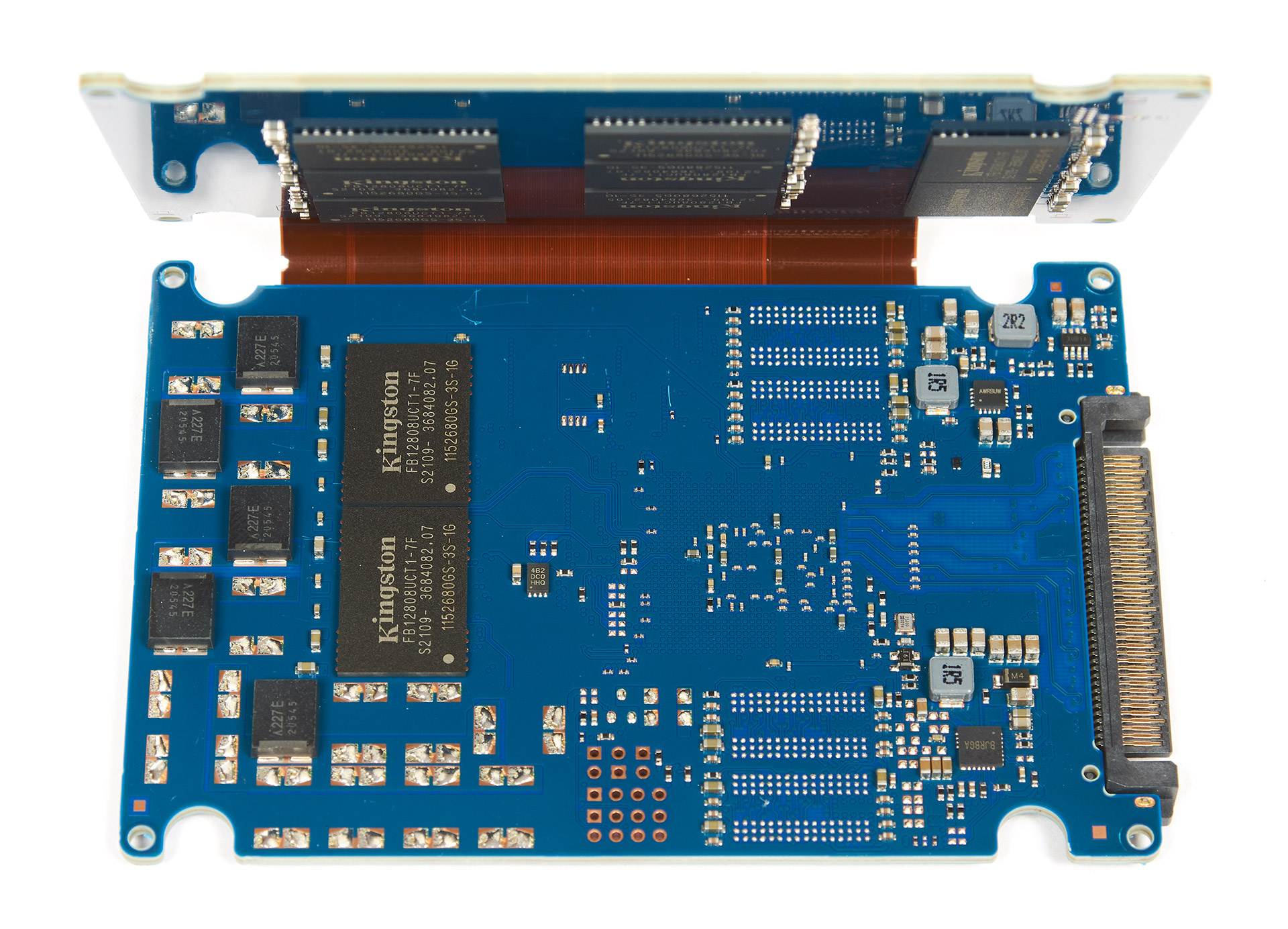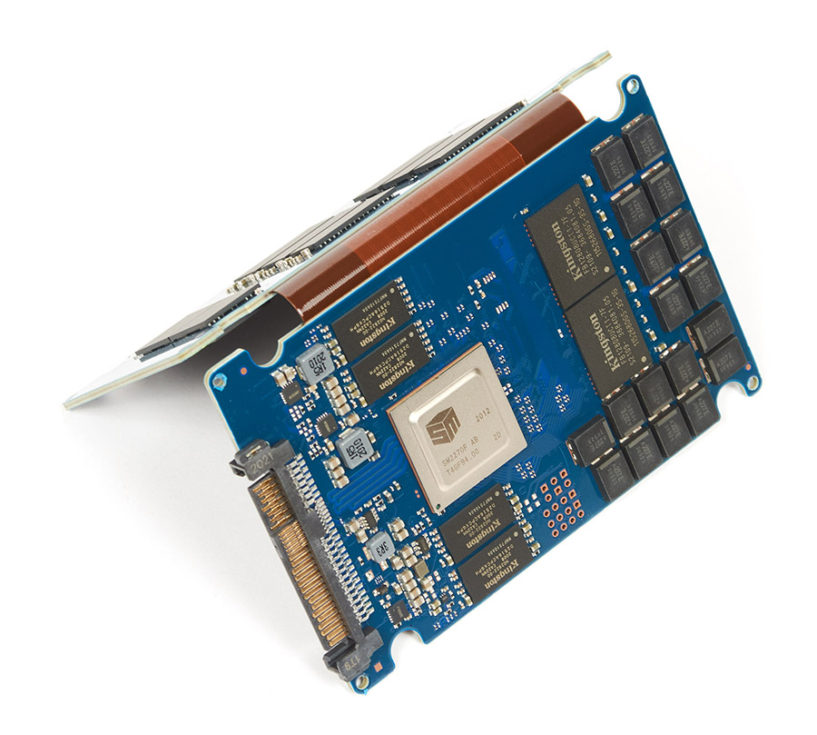 Розкрив накопичувач виявляємо складову конструкцію з двох плат, причому вони невіддільні одна від одної, жорсткий шлейф виходить прямо з текстоліту однієї плати та входить в іншу. Конструкція дуже міцна, потрібно докласти зусиль, щоб розкрити її. На текстоліті розпаяно танталові конденсатори, які зможуть амортизувати нестабільне живлення, а також захистити накопичувач від втрати даних при знеструмленні (PLP).