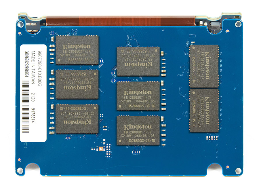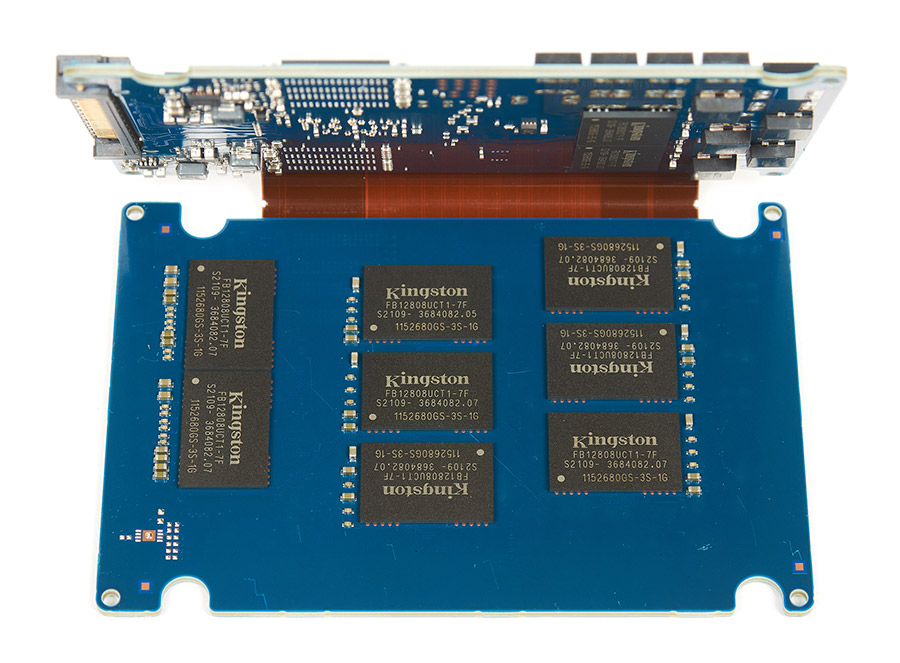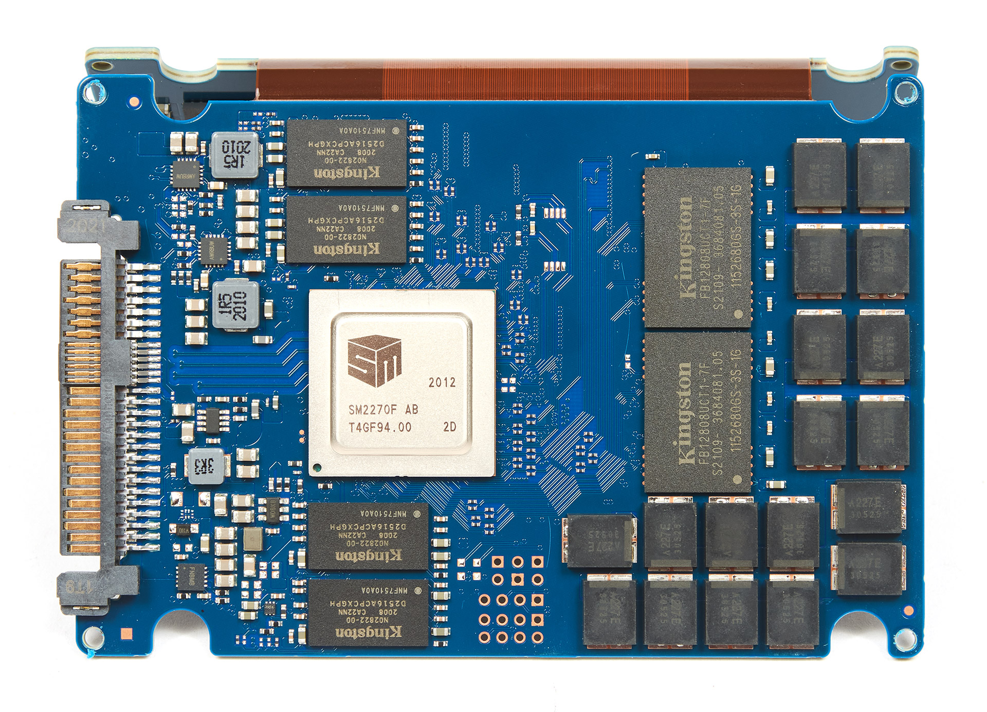 На зовнішній частині головної плати розташований контролер Silicon Motion SM2270F, чотири мікросхеми DRAM-пам'яті (Kingston D2516ACPCXGPH), дві мікросхеми флешпам'яті NAND (Kingston FB12808UCT1-7F), 18 танталових конденсаторів та контактна група U.2 (SFF-8639).