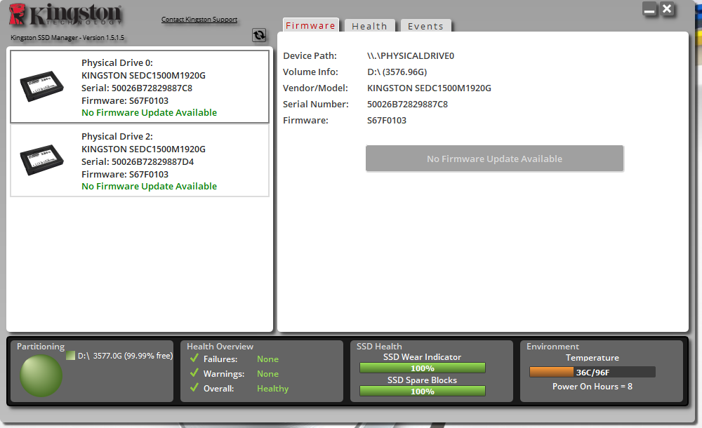 Kingston SSD Manager дозволяє перевірити актуальну прошивку, стерти накопичувач, переглянути журнал подій, а також перевірити датчик температури накопичувача.