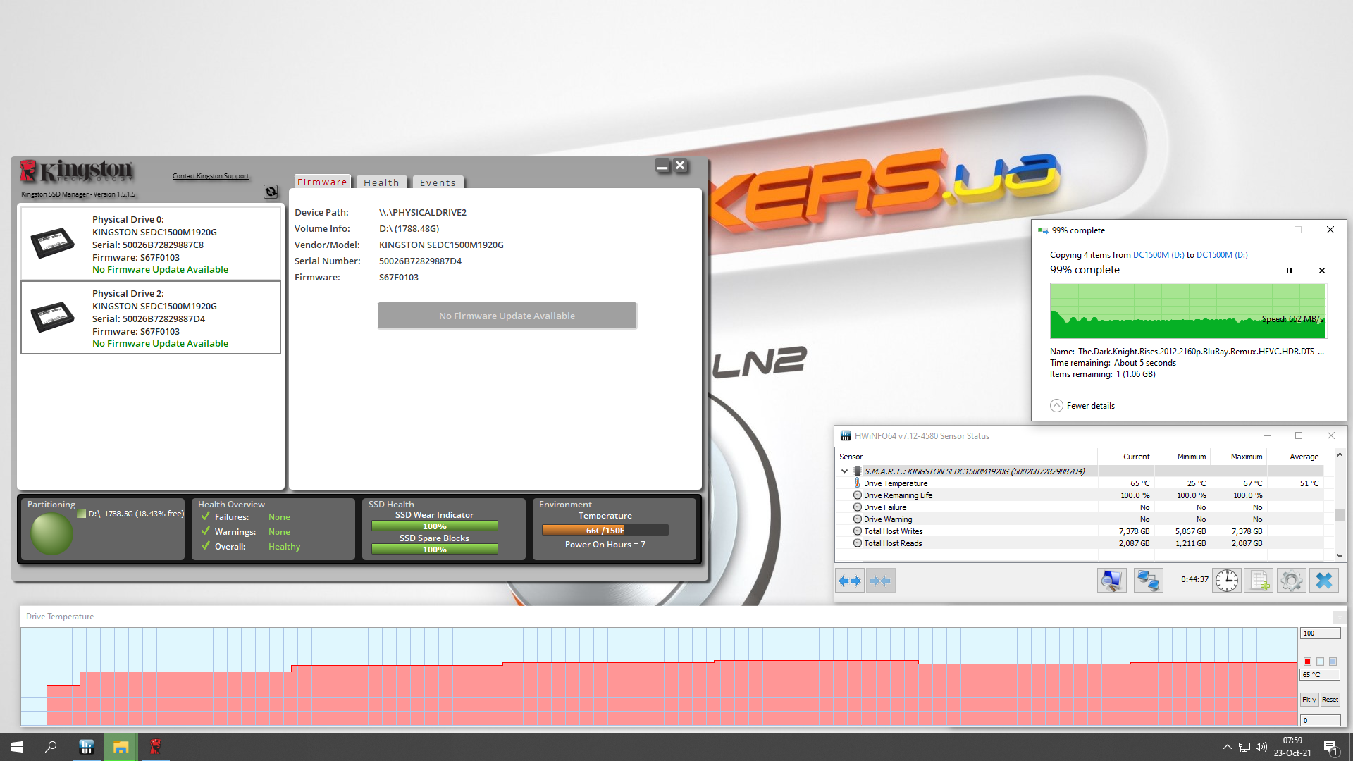 Троттлінг відбувається при нагріванні до 65 градусів, накопичувач уповільнюється вдвічі. Це зовсім не актуально в серверному шасі, проте слід враховувати при складанні workstation. За наявності обдування температура навряд чи вища за кімнатну.