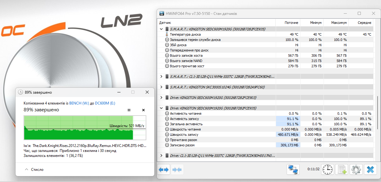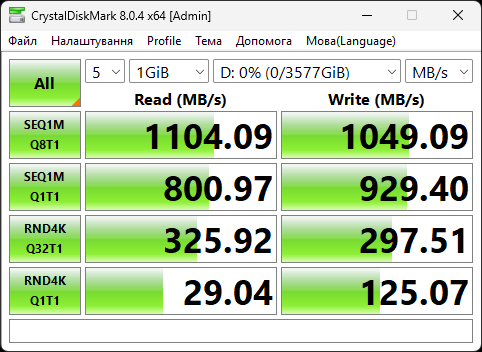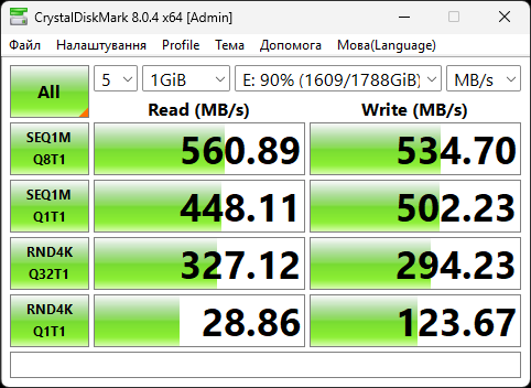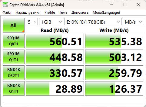 560,51/535,38 Мбайт/с лінійного читання та запису. Втрат продуктивності на заповненому накопичувачі не спостерігається