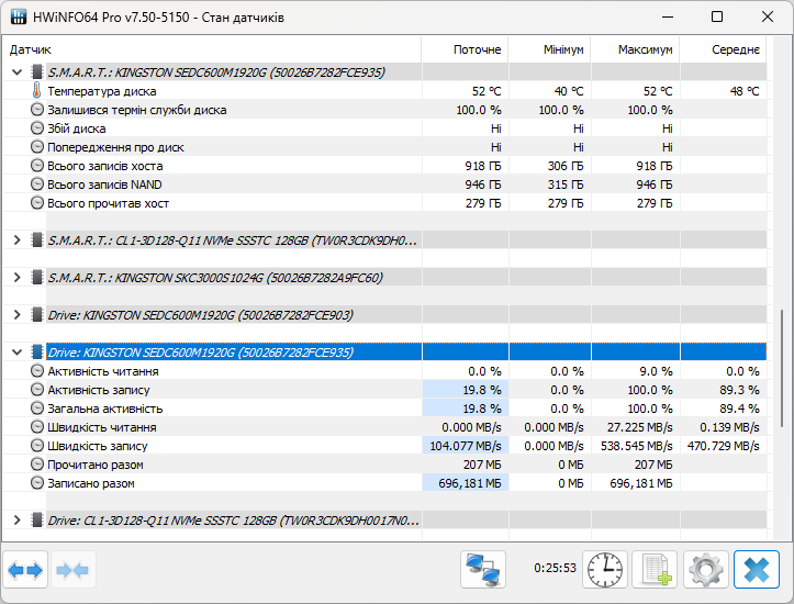 Управління обертами вентилятора було автоматичне. Температура в приміщенні утримувалась на рівні 25 градусів за Цельсієм. Показники температур бралися з моніторингу HWINFO. На SSD штатними засобами MS Windows 11 64-bit був створений логічний розділ із файловою системою NTFS і стандартними налаштуваннями кластера, що займає весь доступний дисковий простір. В середі Linux штатними засобами CentOS створено логічний розділ з файловою системою Ext4 на весь доступний дисковий простір. Накопичувач тестувався порожнім та заповненим на 90%. Також аналізувалась продуктивність двох однакових накопичувачів в режимі RAID 0, тести цього режиму робилися лише на чистому масиві (0% обсягу зайнято).
