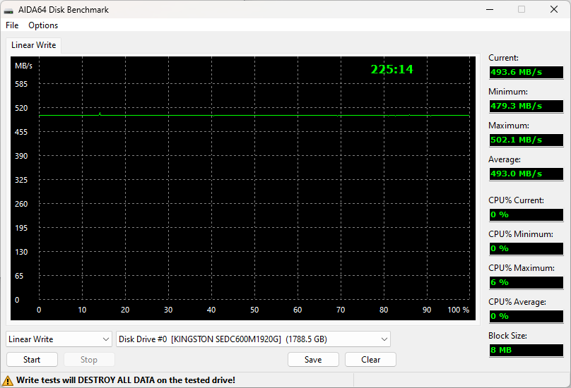 Kingston DC600M 1,92TB показав себе відмінно, середня швидкість запису склала 493 Мбайт/с.