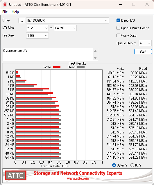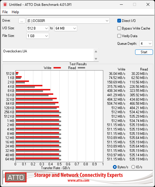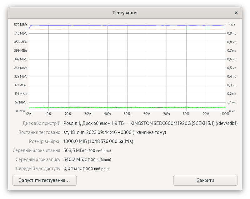 Інтегрований бенчмарк видав результат у 563,5 Мбайт/с для читання, а також 540,2 Мбайт/с для запису з середнім часом доступу 0,04 мс.