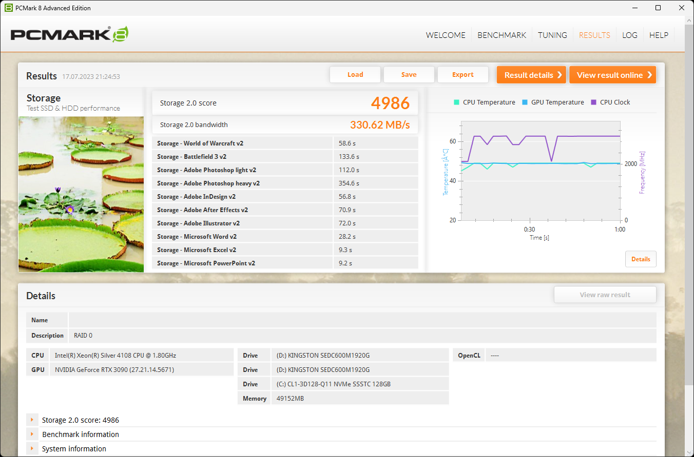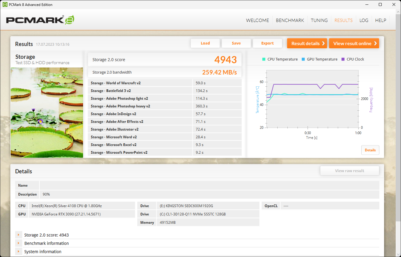Комплексна оцінка накопичувача Storage 2.0 видає швидкість на рівні 269,05 Мбайт/с, заповнений накопичувач втрачає продуктивність на 4% з результатом у 259,42 Мбайт/с.