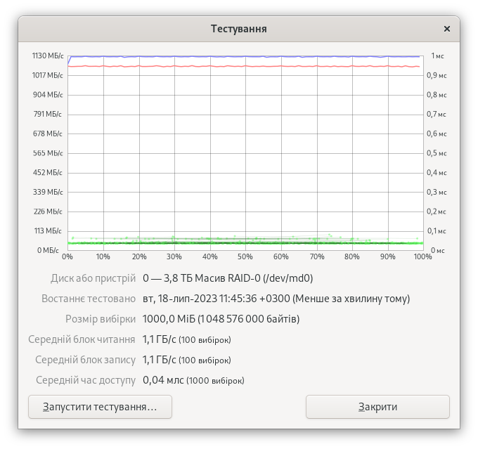 Читання на рівні 99k IOPS, навіть є перевершення заявлених 94k IOPS. RAID забезпечує зростання читання до 136k IOPS.