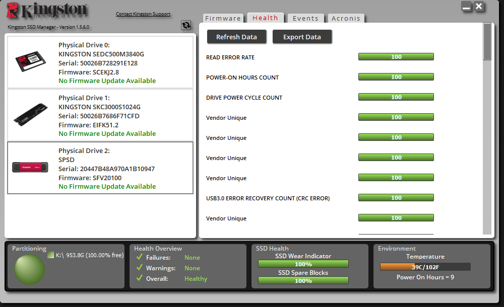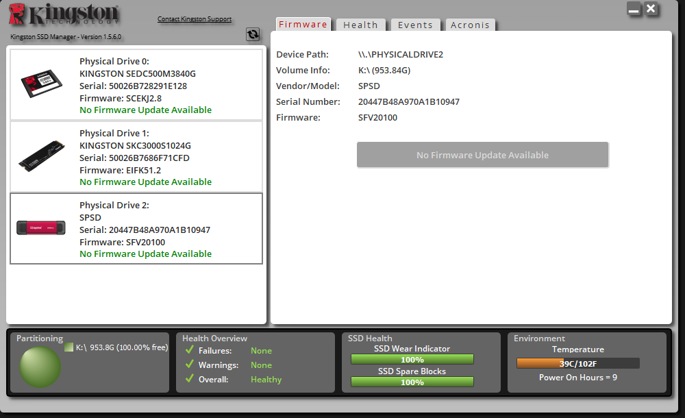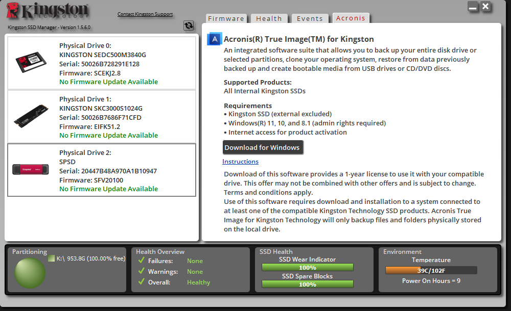 Опціонально виробник пропонує користувачу завантажити утиліту Kingston SSD Manager, в якій можна перевірити наявність нової прошивки для накопичувача, його знос, температуру, переглянути SMART, а також логічні розділи на диску.