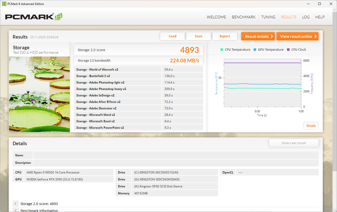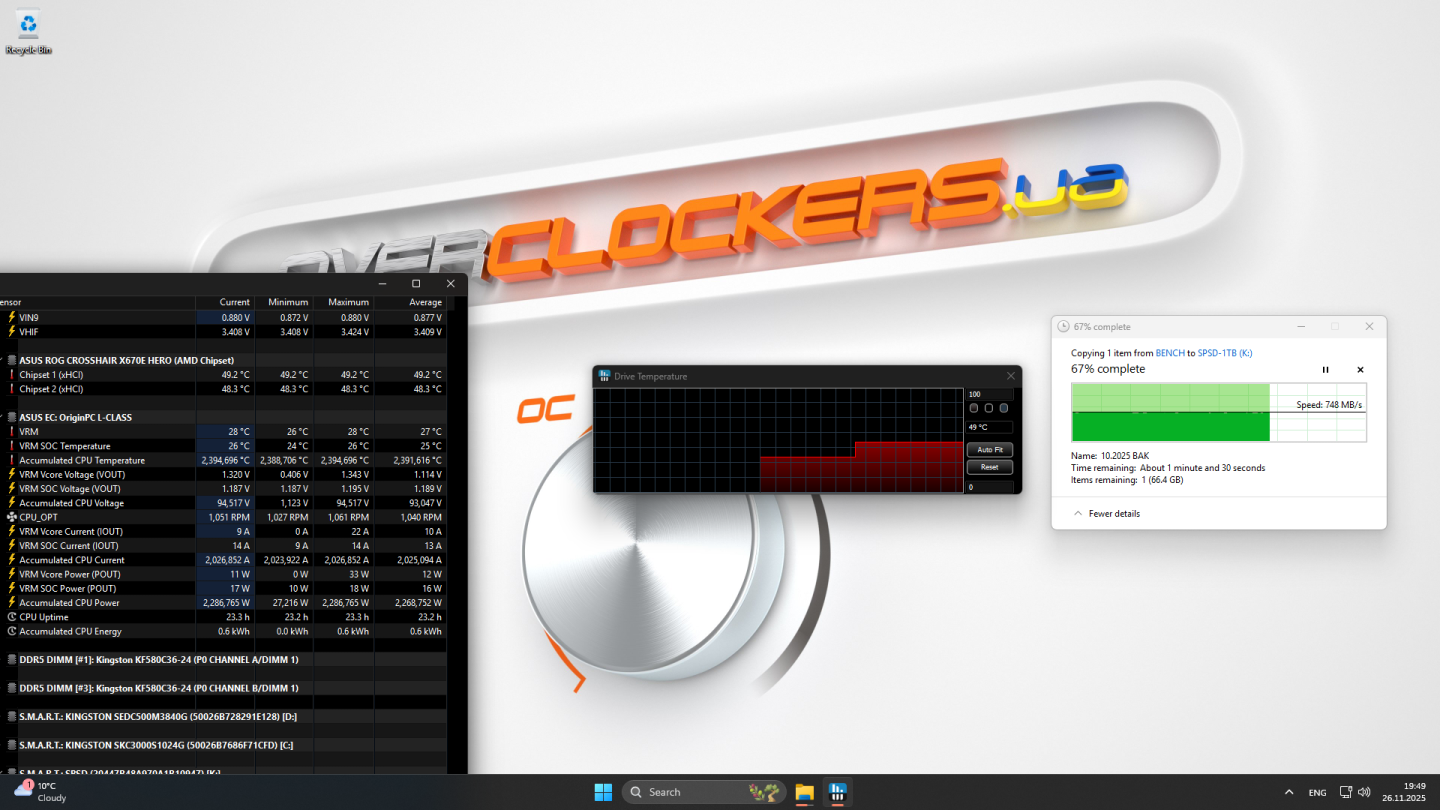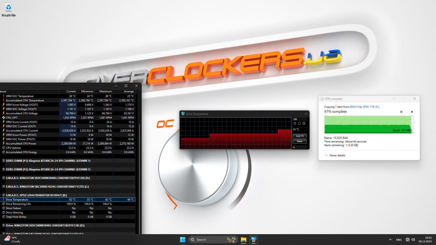 Датчик температури не рапортує о змінах миттєво, за відчуттям він робить це раз на хвилину. По закінченню копіювання тестового архіву накопичувач нагрівся до 62 градусів згідно з датчиками HWINFO. Насправді ж він виявився значно холоднішим.