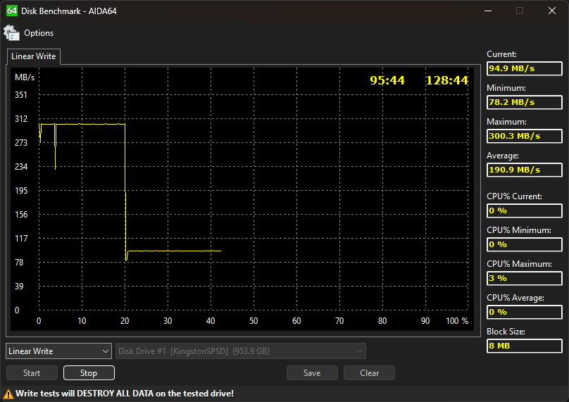 Загалом максимальна швидкість лінійного запису склала 962,3 МБ/с, середня 287,7 МБ/с, а мінімальна 85,5 МБ/с. Після перетину тих самих 20% місткості запис відбувався при швидкості приблизно 135—145 МБ/с, про що слід пам’ятати, якщо від цього накопичувача буде очікуватись інтенсивна експлуатація. А якщо ні — заявлені швидкості не стануть проблемою.