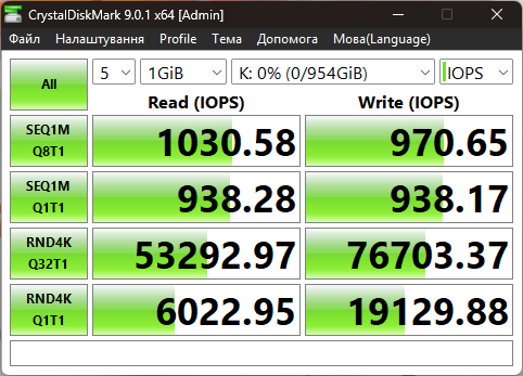 Традиційно розпочнемо з того, чим цей накопичувач буде займатись все своє життя — стандартна робота з файлами. В рамках ОС Windows 11 тестовий архів записувався на накопичувач на швидкості близько 755 МБ/с. У зворотний бік це відбувалось на швидкості близько 864 МБ/с.