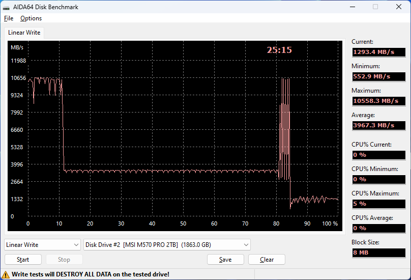 При лінійному запису максимальні показники сягають 10,5 ГБ/с перші десь 11% обсягу SSD, після чого швидкість падає до 3500 МБ/с і до 80% простору накопичувача тримається на такому рівні. Потім швидкість намагається відновитися, але марно і десь на 84% падає до 1300 МБ/с. Така поведінка дозволить як мінімум половину обсягу диска писати на максимальній швидкості.