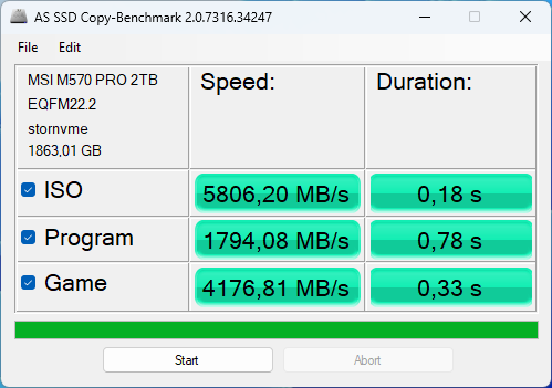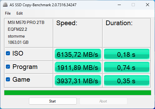MSI Spatium M570 Pro PCIe 5.0 NVMe M.2 Frozr не став виключенням, це дуже швидкій накопичувач, який вже зараз може дати неперевершену продуктивність. Але це справедливо, поки диск заповнений до 50 відсотків свого простору, після чого користувач може розраховувати на невеличкий SLC-кеш обсягом у 60 ГБ для запису на максимальній швидкості, чого вистачить у більшості випадків. Також слід залишати вільним простір у більше ніж 100 ГБ, інакше запис впаде до швидкостей SSD з шиною PCI Express 3.0. Збільшення продуктивності відносно звичайних моделей Spatium M570 змусило виробника встановити габаритну систему охолодження, через яку новий SSD підійде не до кожної материнської плати, і про це не слід забувати при виборі пристрою. Тож якщо потрібна ультимативна продуктивність дискової підсистеми не озираючись на її ціну, накопичувачі Spatium M570 Pro стануть гарним варіантом для збільшення швидкодії системи.
