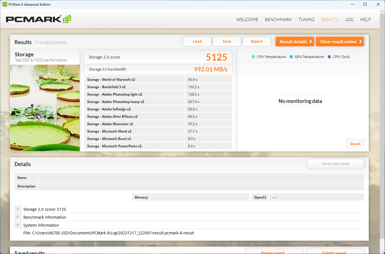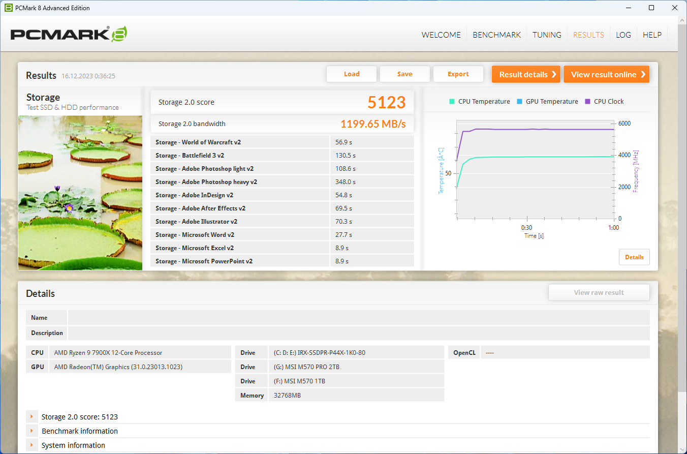 В старому PCMark також отримали максимальну швидкість у 1200 МБ/с, тоді як в тестуваннях до цього вона не перевищувала 970 МБ/с. Заповнений SSD трохи повільніший, але все одно він виходить кращим за старі накопичувачі.