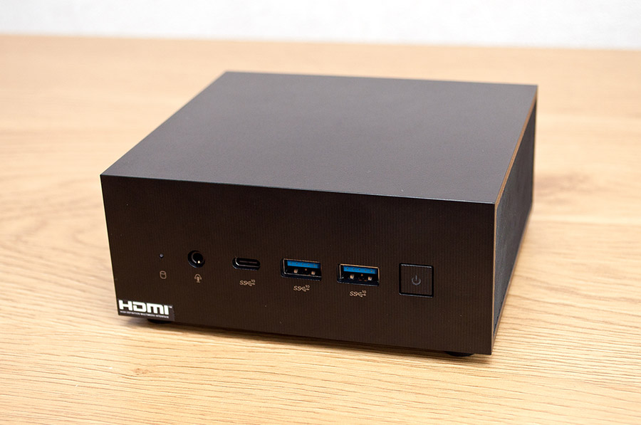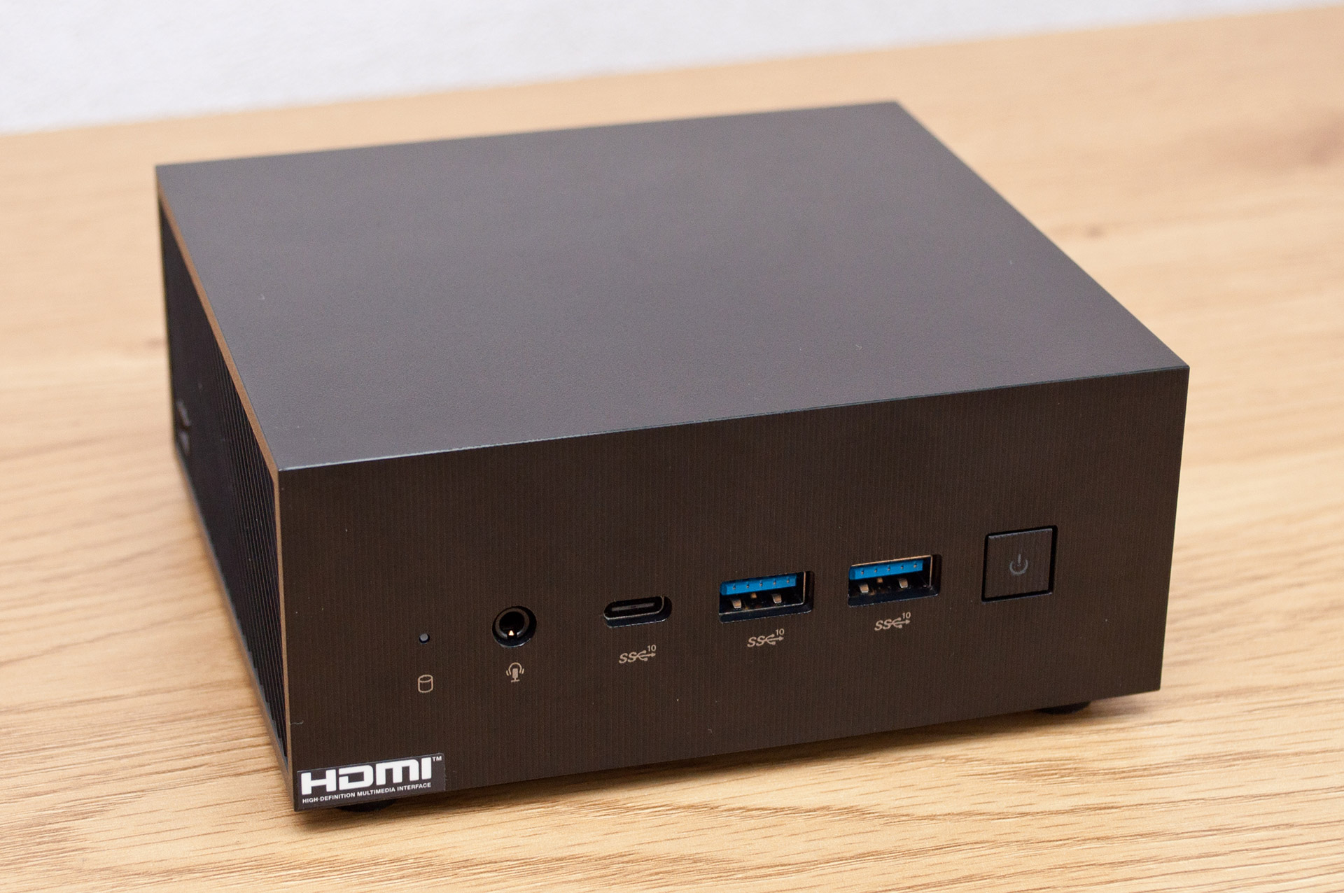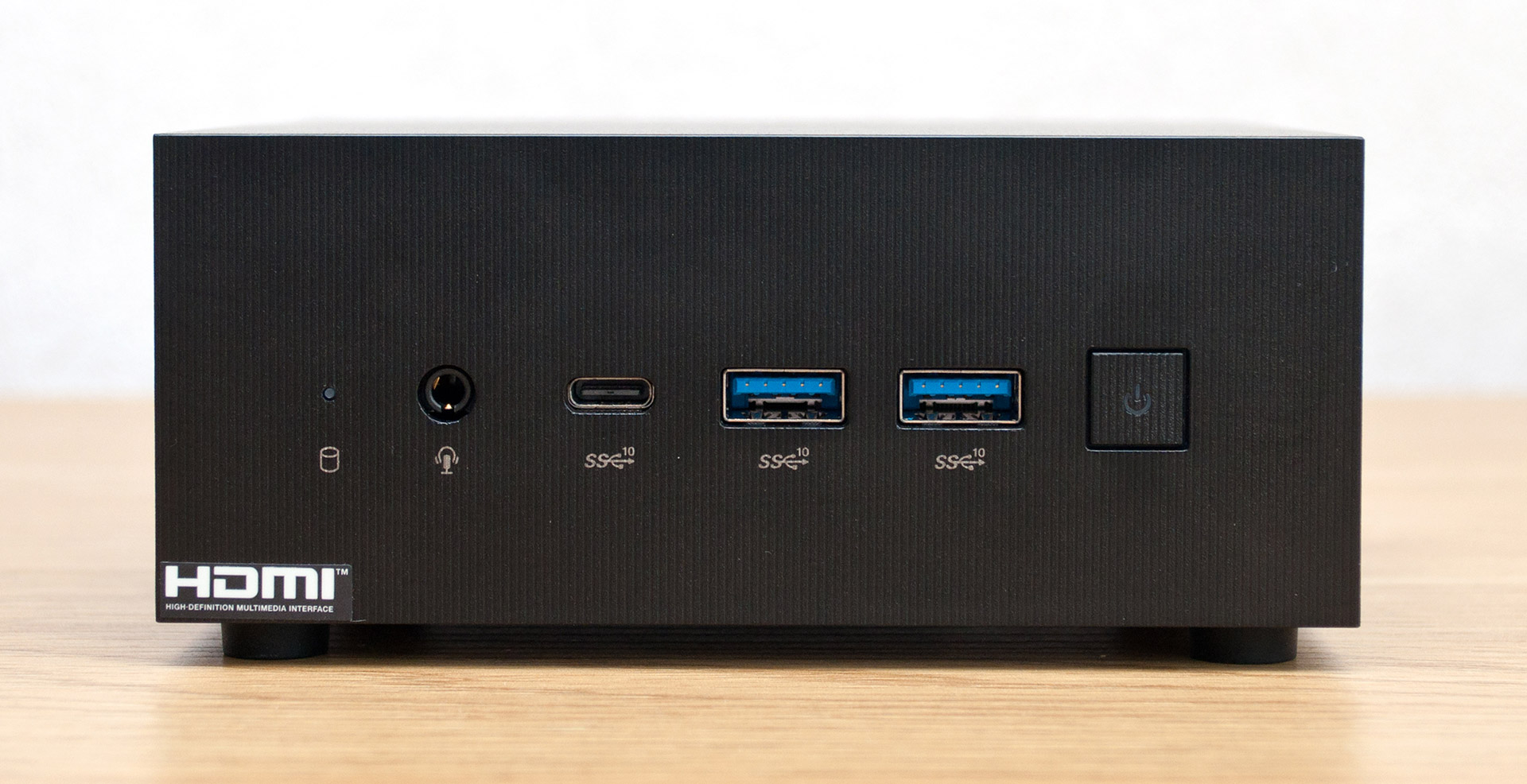 Верхня кришка гладка, а фронтальна грань отримала ледь помітну текстуру з дрібних вертикальних борозен. На передній панелі знаходяться світлодіод, що сигналізує про активність дискової підсистеми, аналоговий звуковий комбінований роз’єм 3,5 мм, підключений до HDA-кодека Realtek ALC3251, і три порти USB 3.2 Gen 2 з пропускною здатністю 10 Гбіт/с, один з яких має конструктив Type C, а решта виконані у вигляді Type A. Справа від них розташована клавіша ввімкнення із вбудованим індикатором живлення, а в лівому нижньому куті можна побачити надпис HDMI. Втім, уважні читачі можуть помітити відсутність логотипа виробника, тож даний пристрій може нести бренд постачальника готових систем, який готовий дообладнати «barebone» оперативною пам’яттю і накопичувачем, інсталювати операційну систему та забезпечити технічну підтримку покупців.