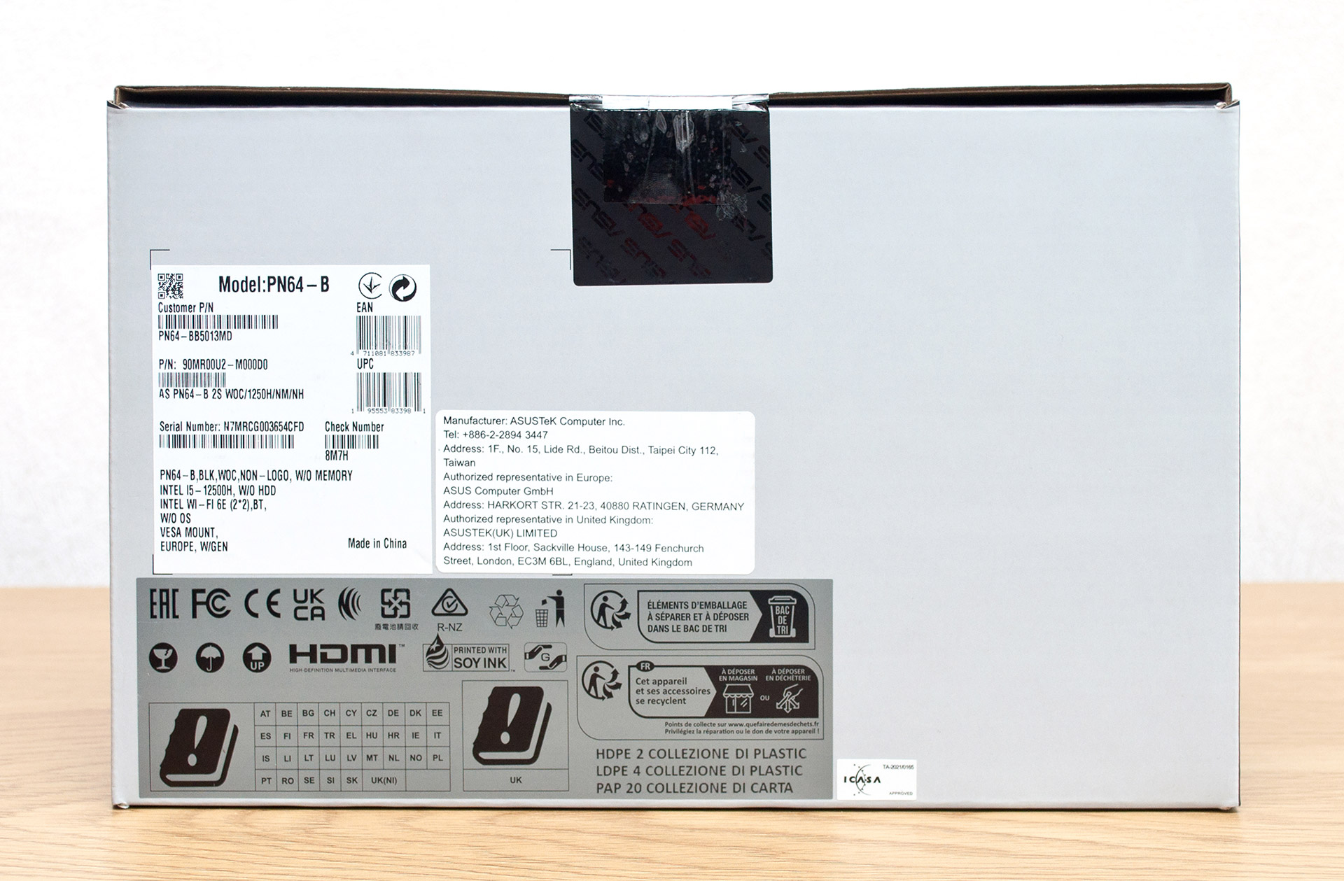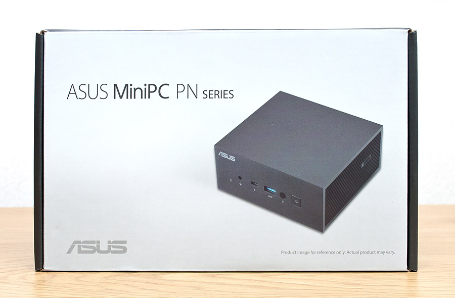 Продукт поставляється в компактній картонній коробці, на лицьовому боці якої нанесено найменування і зображено пристрій… ASUS MiniPC серії PN. В цьому немає нічого дивного, адже сімейство ExpertCenter можна вважати прямими нащадками MiniPC.