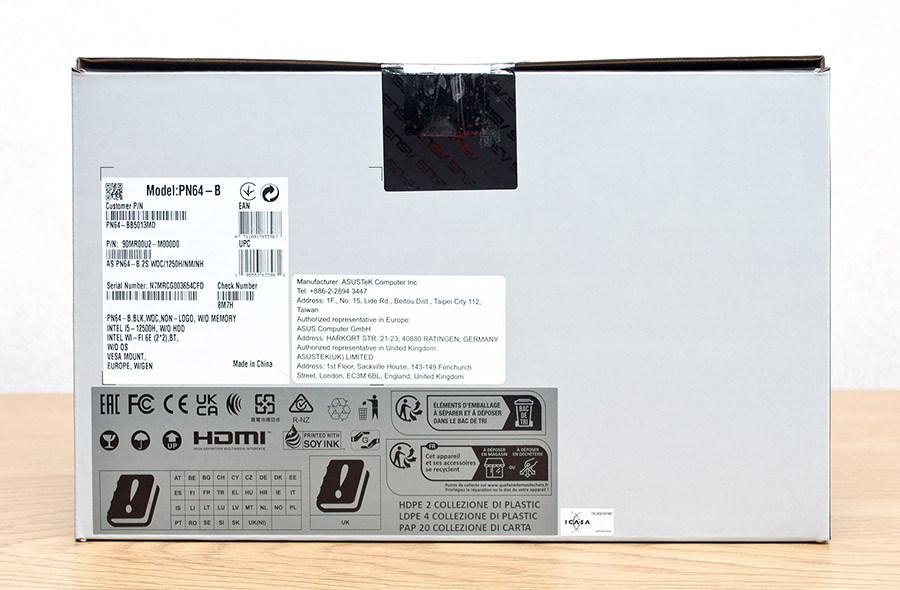 На тильній поверхні упаковки знаходяться наліпки зі службовою інформацією, звідки можна дізнатися про специфікацію головних компонентів та код комплектації PN64-BB5013MD, з якого слідує, що цей екземпляр не оснащений модулями DRAM, накопичувачем та операційною системою. Тож, перед нами «barebone», тобто, комплект для самостійного збирання. Цікаво виглядає рядок NON-LOGO, про це ми поговоримо трохи згодом.