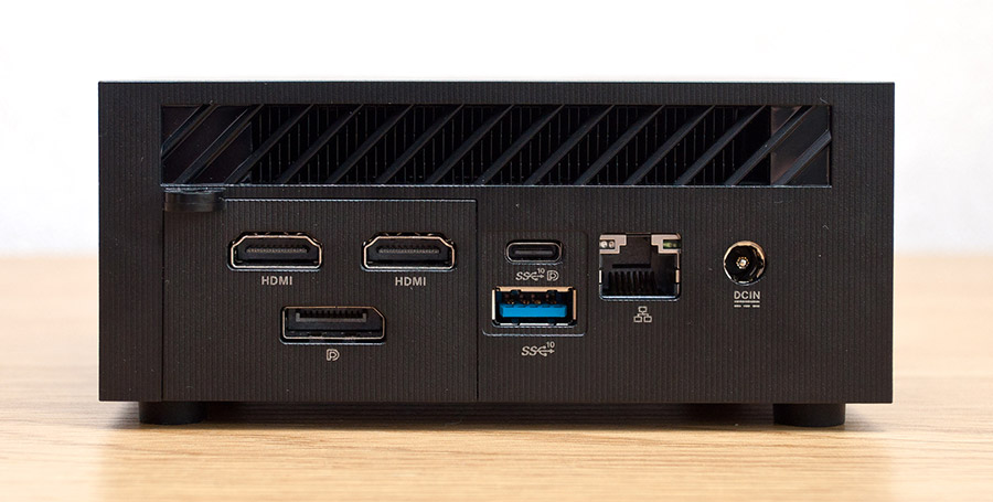 Задня панель несе три цифрові відеовиходи: пару HDMI 2.0 з можливістю виводу зображення з роздільною здатністю 4К та частотою 60 Гц та один DisplayPort версії 1.4a, який дозволяє підключати дисплеї з матрицями 8К та частотою оновлення 60 кадрів на секунду. В залежності від модифікації замість роз’єму DisplayPort можуть бути встановлені відеовиходи VGA або HDMI 2.1, мережевий інтерфейс 2.5G Ethernet чи навіть СОМ-порт. Окрім того, на задній панелі ExpertCenter PN64 знайшлося місце для пари роз’ємів USB 3.2 Gen 2: одного у виконанні Type A, тоді як другий — Type C — підтримує протокол Power Delivery та вивід зображення по стандарту DisplayPort 1.4a. Справа від них знаходиться мережевий інтерфейс 10/100/1000/2500 BaseT, за роботу якого відповідає контролер Intel i225V, та роз’єм для підключення зовнішнього блоку живлення. Зверху над портами розташована решітка для відводу нагрітого повітря від системи охолодження.