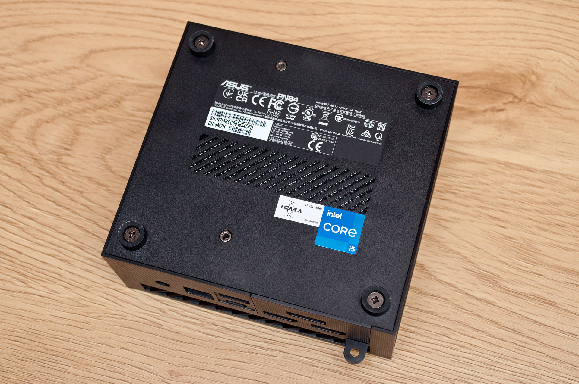 По центру нижньої кришки можна побачити вентиляційні отвори, а по кутах знаходяться чотири круглі гумові ніжки, в центрі яких розташовані гвинти, що фіксують нижню частину корпусу. Над вентиляційними отворами є наліпка зі службовою інформацією, а під нею — наліпка Intel Core-i5, що прямо вказує на сімейство центрального процесора, на якому побудований даний екземпляр ExpertCenter PN64. Для встановлення металевої рамки-кріплення на кронштейн VESA передбачено два отвори з різьбою.