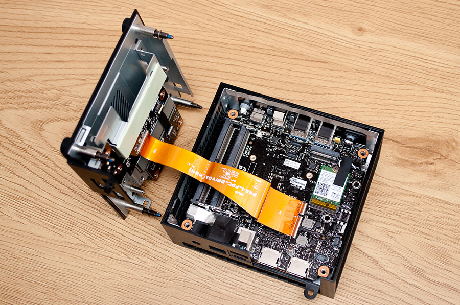 Нижня кришка виконує функцію шасі для встановлення накопичувача формату 2,5” з інтерфейсом SATA 6 Гбіт/с і висотою до 9 мм та несе на собі порт DisplayPort 1.4а або інший інтерфейс в залежності від модифікації. Для зв’язку з системною платою використовується гнучкий шлейф, він достатньо довгий, щоб не заважати інсталяції компонентів, а за необхідності його можна легко від’єднати.