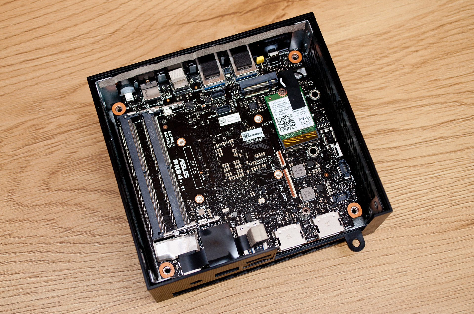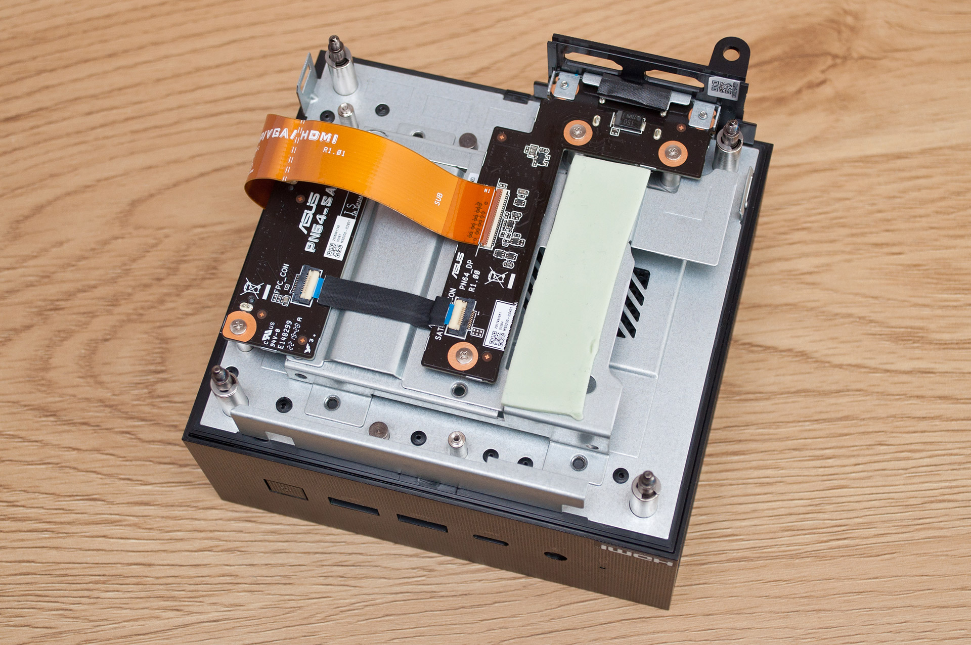 Системна плата займає більшу частину внутрішнього простору корпусу. Зліва знаходяться два слоти, здатні прийняти модулі SO-DIMM DDR5 з тактовою частотою 4800 МГц та сумарним обсягом 32 ГБ. В правій частині розташований порт для встановлення SSD формату 2280 з інтерфейсом NVMe. До нього підведено чотири лінії PCI-Express 4.0, тож ExpertCenter PN64 здатен працювати з сучасними високошвидкісними накопичувачами. Поруч видніється роз’єм NGFF, зайнятий адаптером бездротових мереж Intel AX211 з підтримкою Wi-Fi 6E та Bluetooth 5.2.