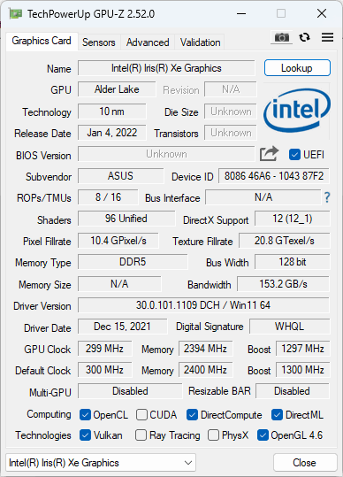 Core-i5 12500H оснащений двоканальним контролером оперативної пам’яті, сумісним з модулями DDR5 частотою 4800 МГц та DDR4 3200 МГц, хостом PCI Express 4.0 на 28 ліній та підтримкою високошвидкісного інтерфейсу Intel Thunderbolt 4, який, на превеликий жаль, не реалізовано в ASUS ExpertCenter PN64. Проте, центральний процесор може похизуватися наявністю потужного вбудованого відеоядра Intel Iris Xe Graphics, що містить 80 виконавчих блоків з робочою частотою до 1300 МГц включно. Графічний акселератор підтримує API DirectX 12.1 та OpenGL 4.6, а вбудований блок Quick Sync відповідає за апаратне прискорення кодування і декодування всіх актуальних відеоформатів, у тому числі 12-бітних VP9 та HEVC.