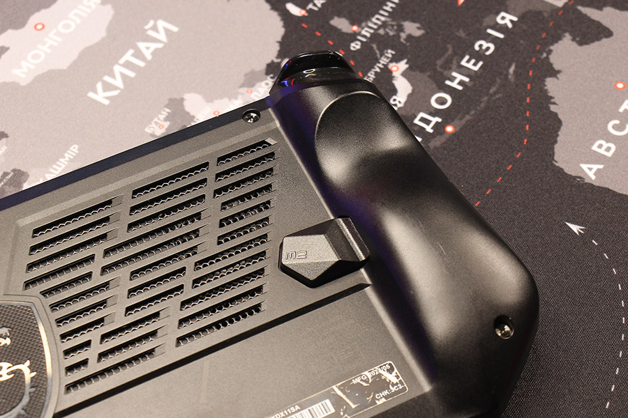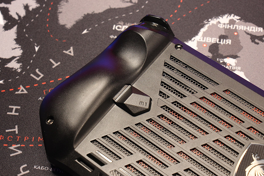 При цьому MSI Claw помітно важче смартфона, геймпада того ж Xbox та старих мікроконсолей типу Sony Playstation Portable/Vita, але тримати його зручно і, власне, навіть зручніше — бо завдяки екрану посередині руки не так близько одна до одної. До описаної вище класичної схеми геймпада MSI додали дві функціональні кнопки по боках екрана (одна для виклику застосунку MSI Master M, одна для швидкого доступу до налаштувань OSD-меню) та дві макрокнопки під середні пальці. Важливо відзначити, що стікі побудовані на основі датчиків Хола, тож правильно працюють і є шанс, що довго не вийдуть з ладу. Фірмове RGB-підсвічування MSI Mystic Light навколо стіків та під чотирма основними кнопками зручно при грі у темряві та додає цікавості у зовнішній вигляд (при роботі від батареї легко налаштувати автоматичне вимкнення).