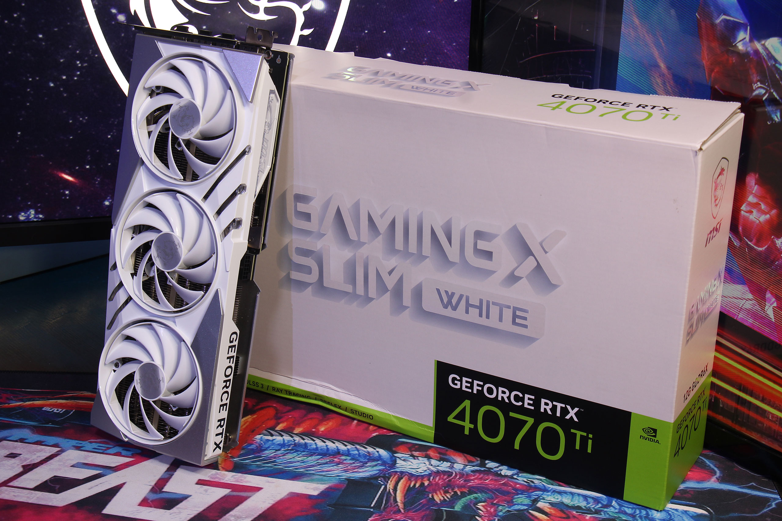 Так само восени 2023 року ми вже детально окремо розглянули відеокарту MSI GeForce RTX 4070 Ti Gaming X Slim White 12G. Це навіть той самий екземпляр, що можна помітити по пом'ятості на коробці знизу ліворуч, так що абсолютно нічого нового сказати про цю карту не вийде. Окрім того, що з естетичних міркувань її було цей раз встановлено разом з комплектною білою ж підпіркою з написом «Gaming Slim». Іронічно, що таким чином саме slim-рішення з відповідним написом візуально зайняло всі п'ять слотів розширення в корпусі. Ну й при цьому зрозуміло, що підпірка ніяким чином не заважає вставити якусь карту PCIe 1x в єдиний вільний слот на материнській платі, але нам ставити туди було все одно нічого, а вигляд так був солідніше та біліше.