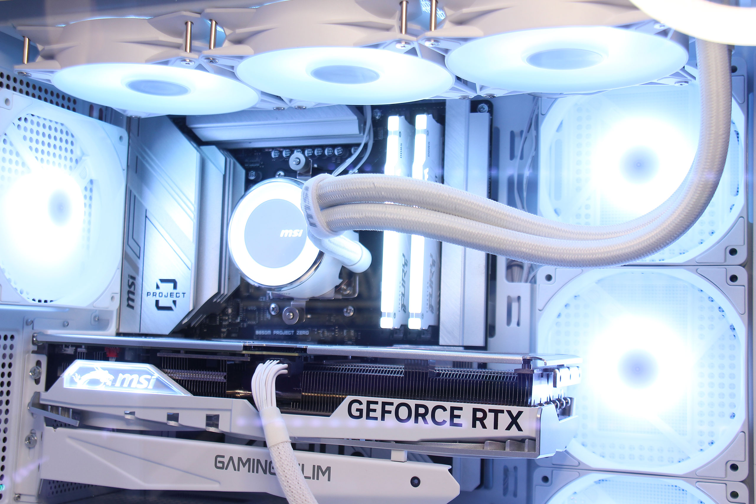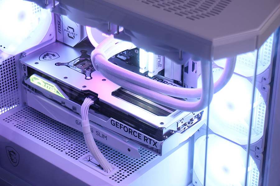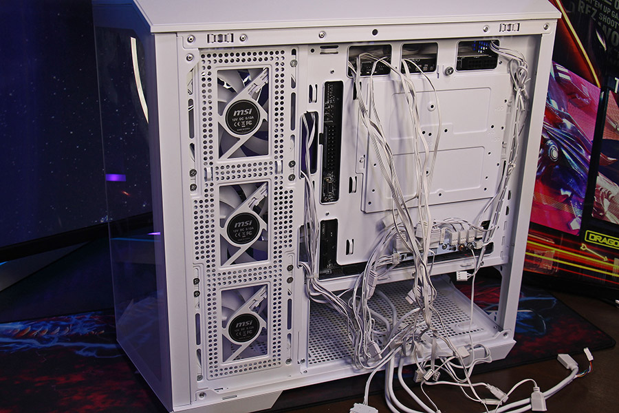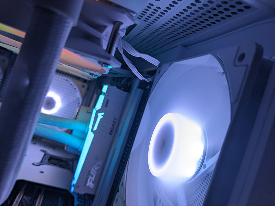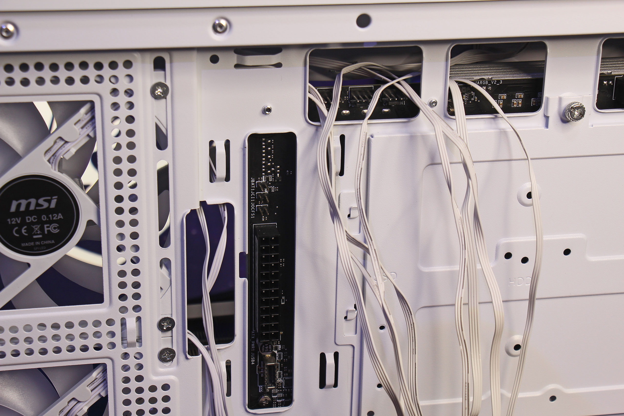 Якщо не полінитися та акуратно прокласти дроти від вентиляторів СРО, то загальну ідилічну картину «бездротового ПК» будуть псувати тільки два тоненьких кабелі від водоблоку MSI MAG Coreliquid E360 White, адже PCB у материнської плати чорна, а дроти білого кольору безальтернативно йдуть поміж неї. Мабуть, на власному ПК є сенс їх просто пофарбувати маркером, щоб не так впадали в очі. Ну й, звісно, нікуди не зник великий товстий кабель живлення відеокарти. Найкраще, що з ним можна зробити — це купити ARGB-подовжувач на кшталт Lian Li Strimer і перетворити наявність дротів з мінуса системи на плюс.