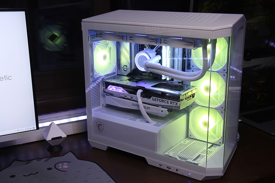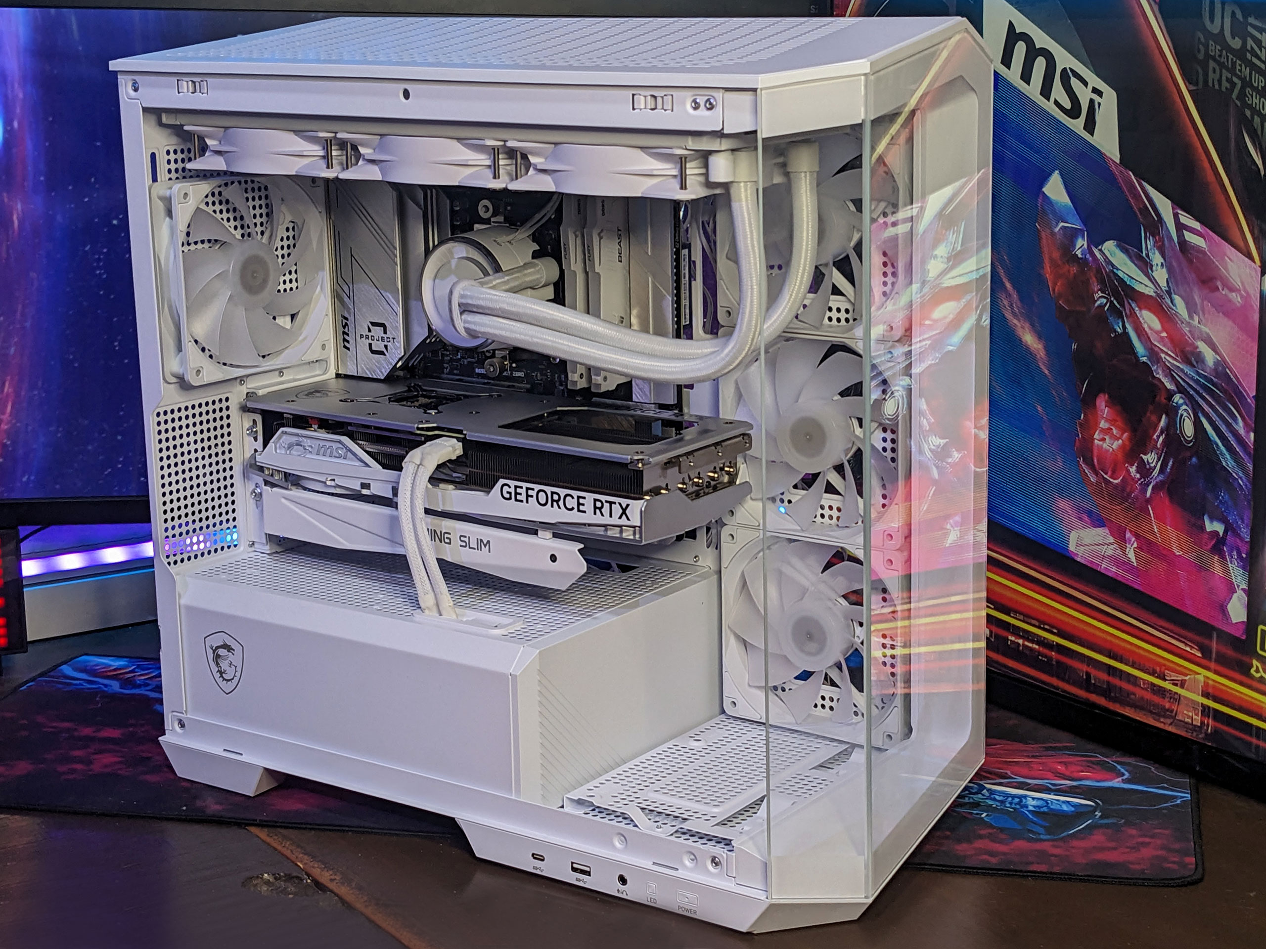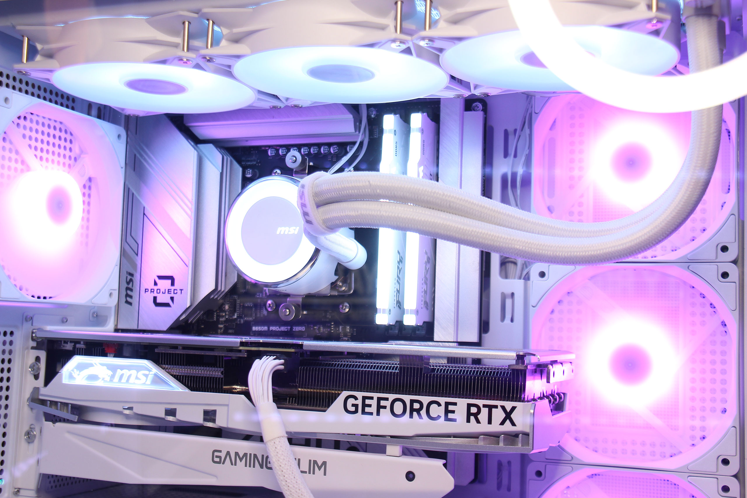 Якщо не полінитися та акуратно прокласти дроти від вентиляторів СРО, то загальну ідилічну картину «бездротового ПК» будуть псувати тільки два тоненьких кабелі від водоблоку MSI MAG Coreliquid E360 White, адже PCB у материнської плати чорна, а дроти білого кольору безальтернативно йдуть поміж неї. Мабуть, на власному ПК є сенс їх просто пофарбувати маркером, щоб не так впадали в очі. Ну й, звісно, нікуди не зник великий товстий кабель живлення відеокарти. Найкраще, що з ним можна зробити — це купити ARGB-подовжувач на кшталт Lian Li Strimer і перетворити наявність дротів з мінуса системи на плюс.