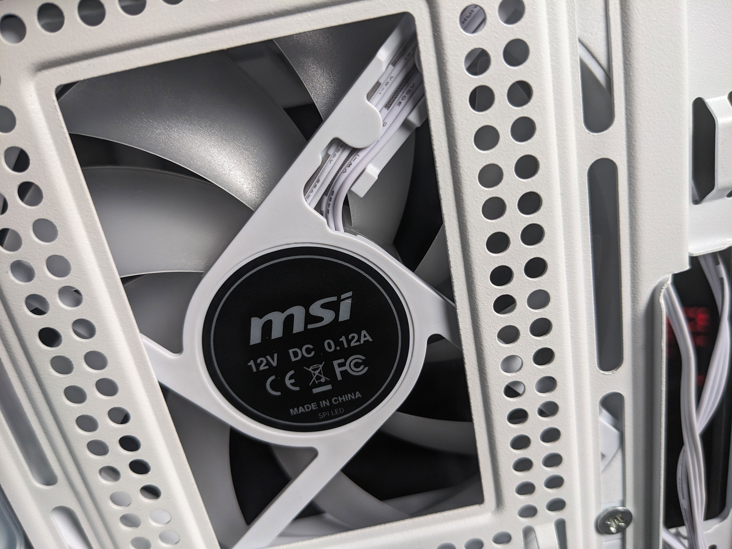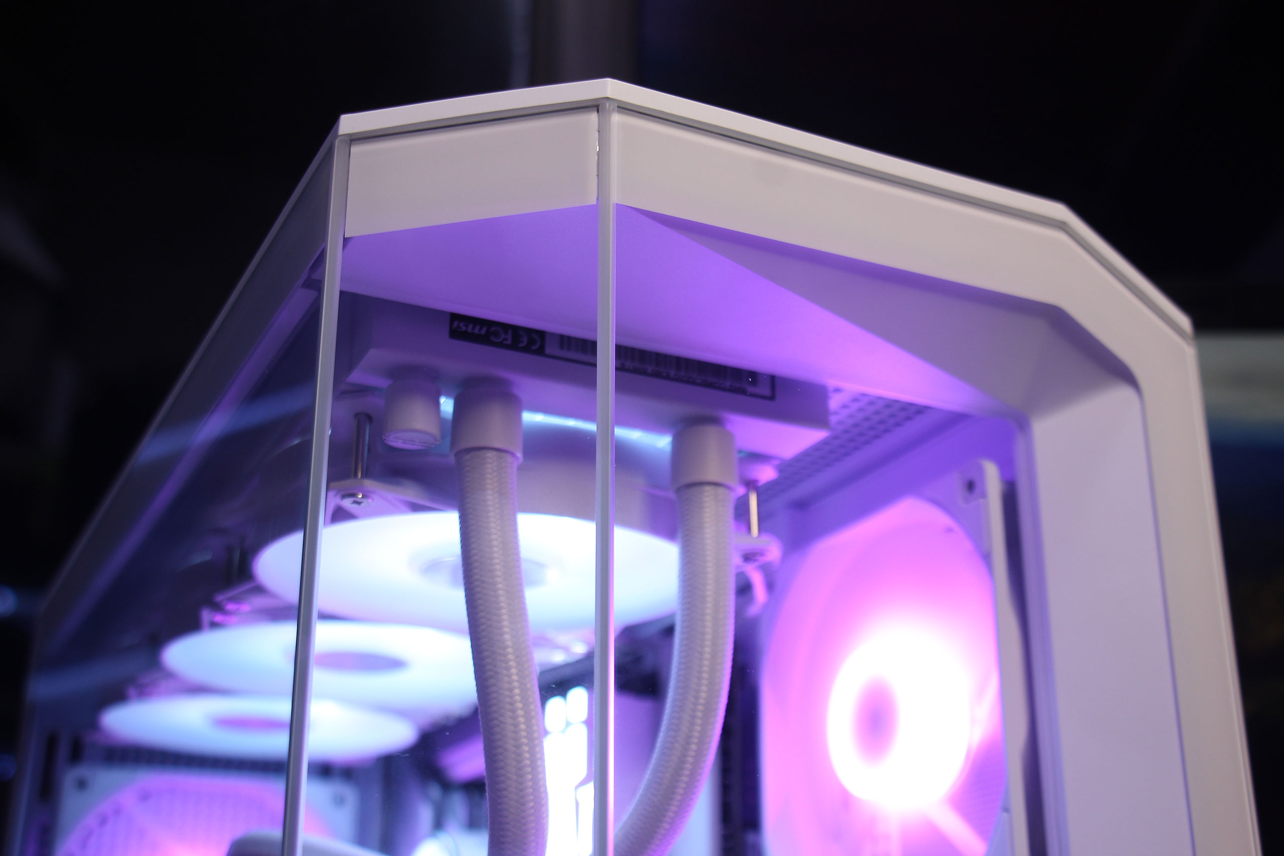 Якщо не полінитися та акуратно прокласти дроти від вентиляторів СРО, то загальну ідилічну картину «бездротового ПК» будуть псувати тільки два тоненьких кабелі від водоблоку MSI MAG Coreliquid E360 White, адже PCB у материнської плати чорна, а дроти білого кольору безальтернативно йдуть поміж неї. Мабуть, на власному ПК є сенс їх просто пофарбувати маркером, щоб не так впадали в очі. Ну й, звісно, нікуди не зник великий товстий кабель живлення відеокарти. Найкраще, що з ним можна зробити — це купити ARGB-подовжувач на кшталт Lian Li Strimer і перетворити наявність дротів з мінуса системи на плюс.