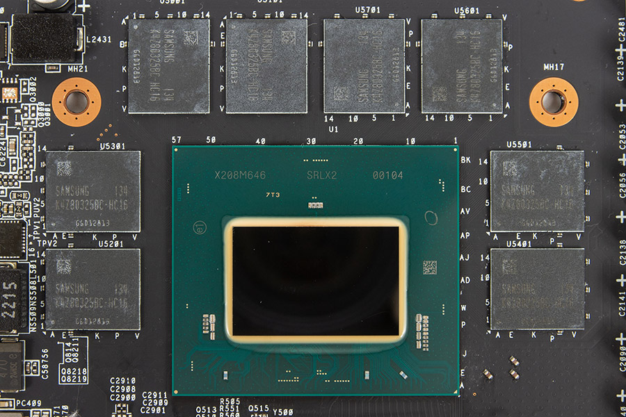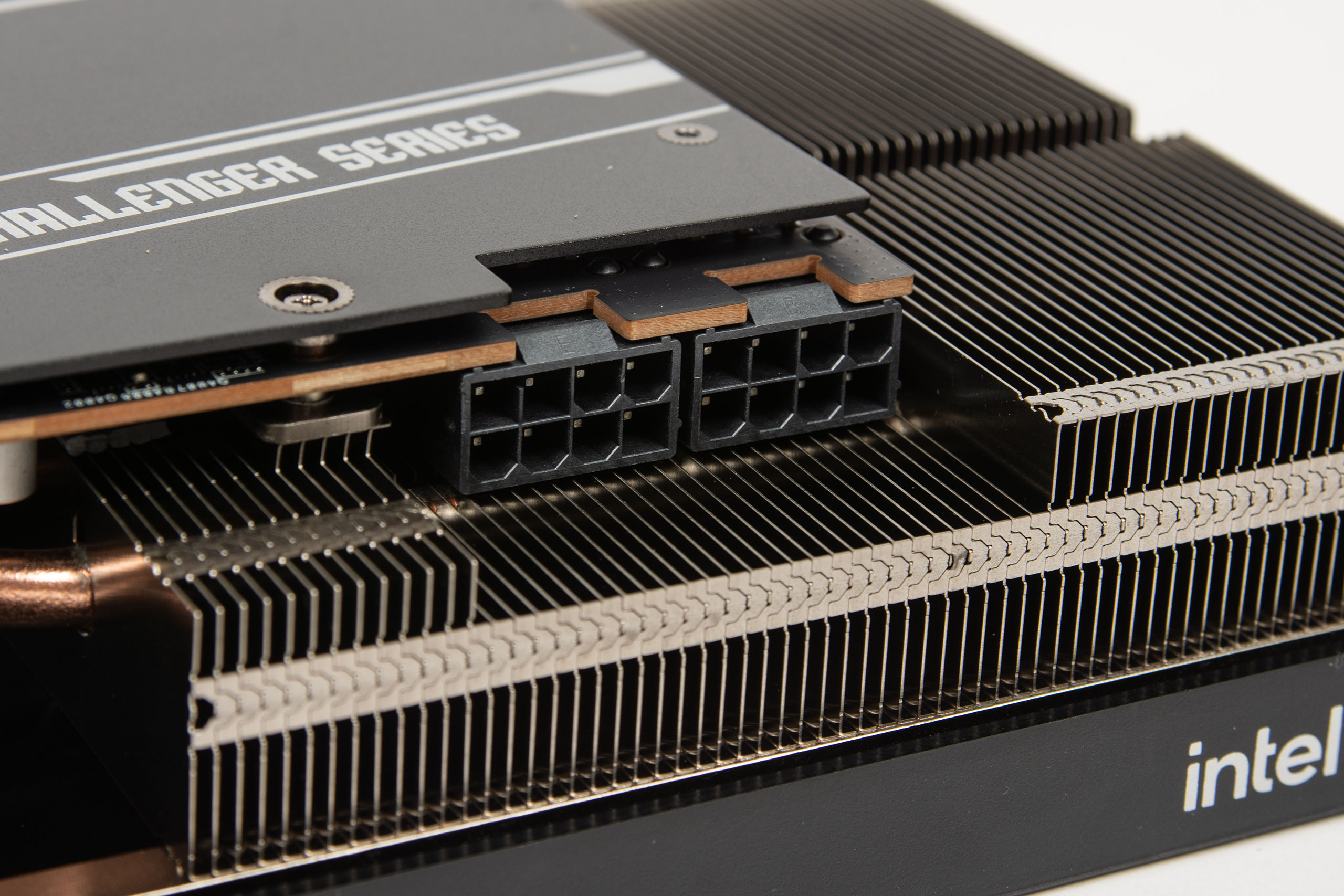 Чип Intel SRLX2, він же DG2-512, має прямокутну форму. Захисна рамка відсутня. VRAM розташовано близько до чипа, її набрано вісьмома мікросхемами пам’яті Samsung K4Z80325BC-HC16, що дають загальний обсяг 8 ГБ. Обмін даними відбувається через 256-бітну шину.