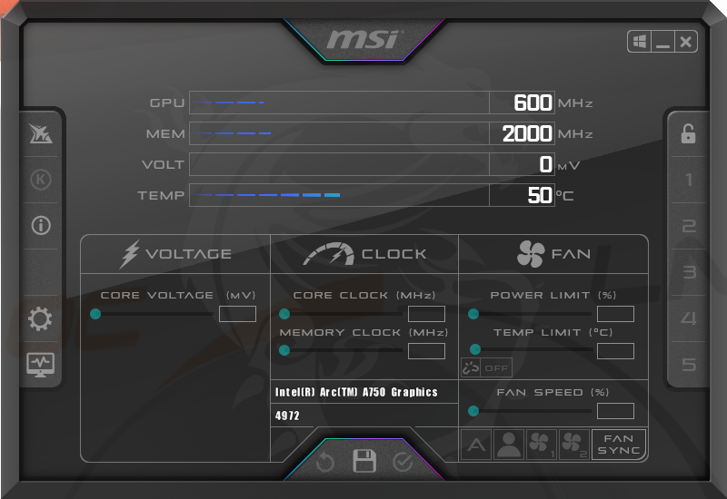 ПЗ інших виробників, наприклад MSI Afterburner, на момент грудня 2023 року все ще не навчилося регулюванню Intel Arc. Для цього потрібне програмне забезпечення з підтримкою API Intel IGCL (Intel Graphics Control Library).