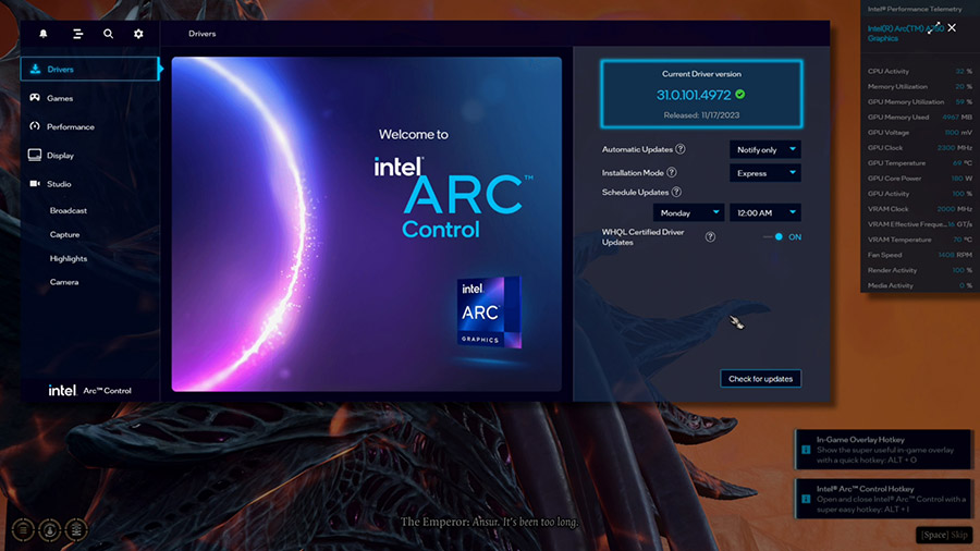 Заводським драйвером Intel передбачено власну панель керування, а також ігровий оверлей. Тут можна обирати рекомендовані налаштування під конкретні ігри. Є функції моніторингу, оверклокінгу, стримінгу, захоплення картинки з екрана (або зовнішньої камери) та класних моментів з ігор (game highlights). Користувач може визначити бітрейт відео, аудіо, фреймрейт, роздільну здатність.
