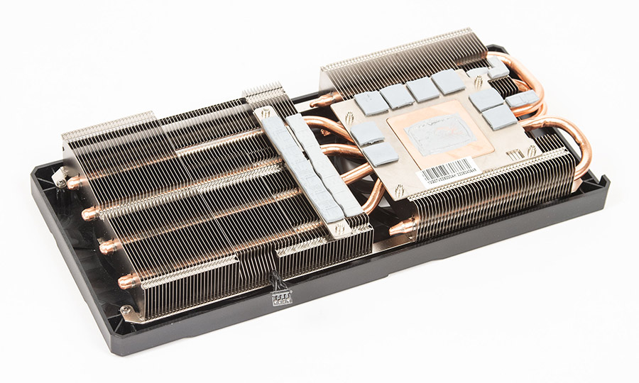 Радіатор складається з двох секцій тонких алюмінієвих пластин. Їх пронизують чотири теплові трубки. Система охолодження відводить тепло від ядра, мікросхем пам’яті, ШІМ та фаз живлення.
