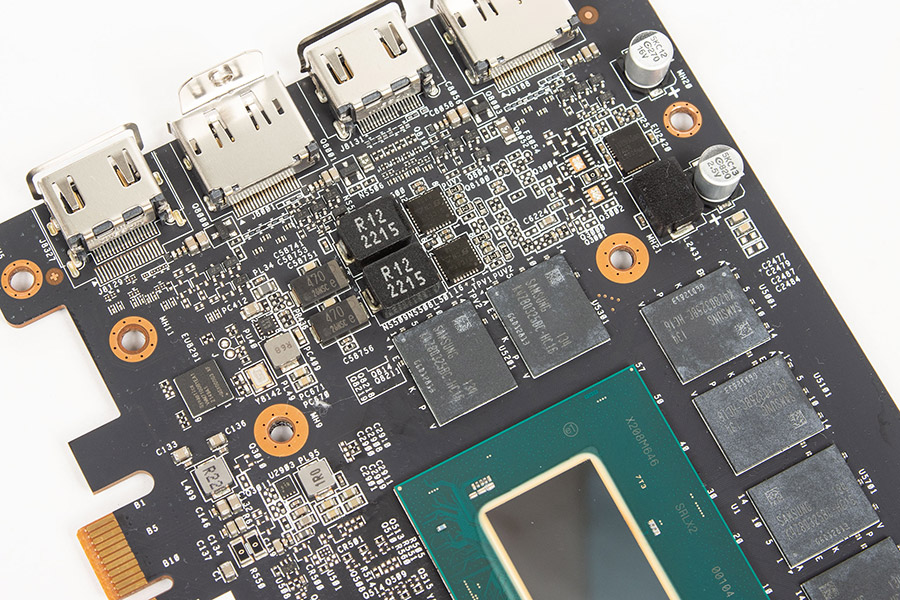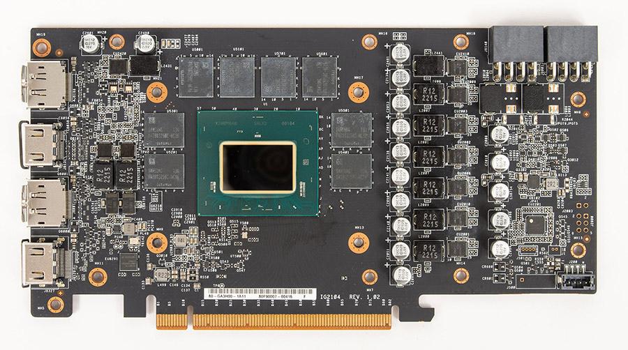 Для живлення GPU передбачено сім фаз на базі силових елементів Renesas ISL99390FRZR, що розраховані на 90 А. Вони керуються ШІМ-контролером Renesas RAA229001. Для живлення VRAM використовується вже дві фази на базі силових елементів Vishay SiC654. Вони розраховані на 50 А та керуються ШІМ-контролером uPI Semiconductor uP9505P.