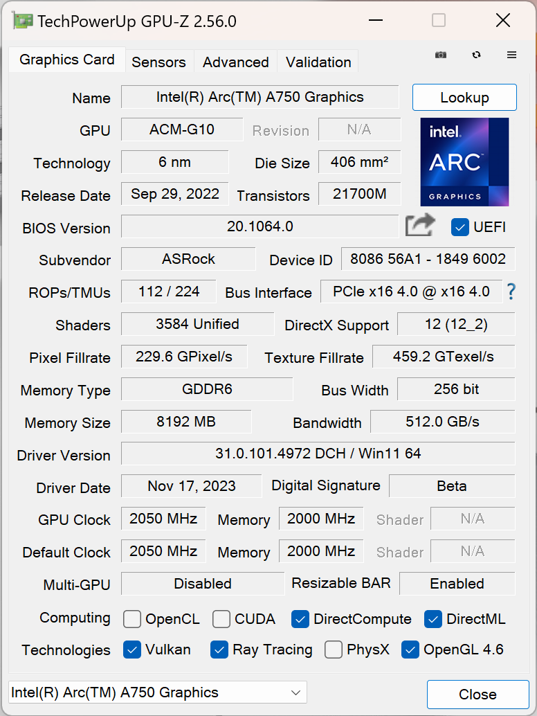 | Модель та сторінка продукту | Intel Arc A750 Challenger D 8GB OC |