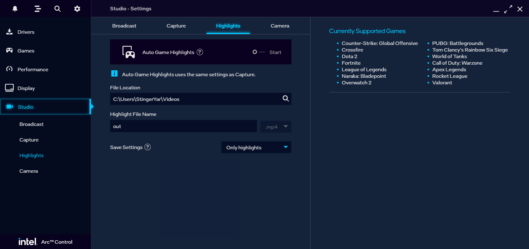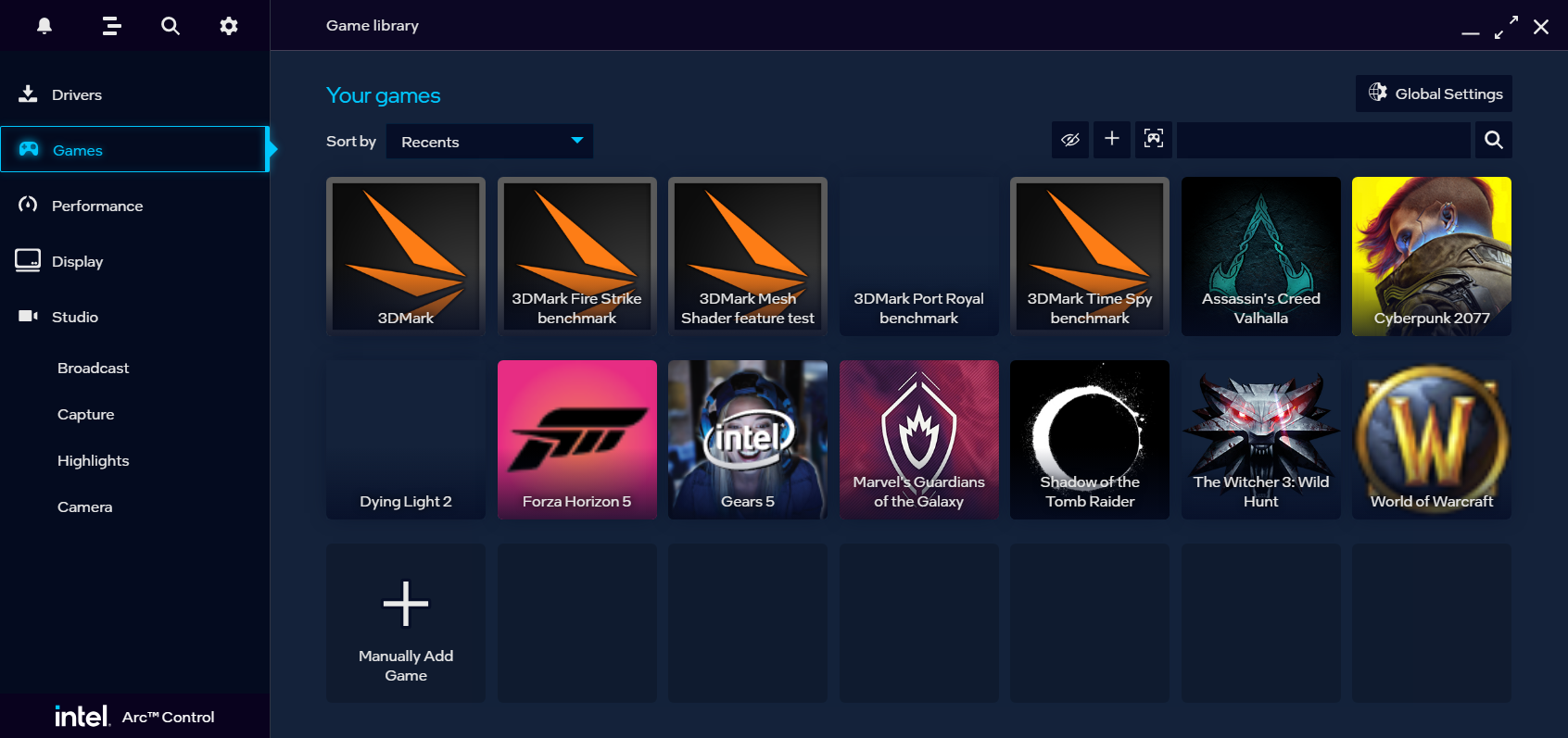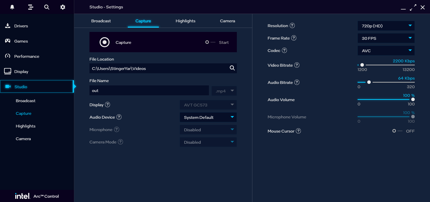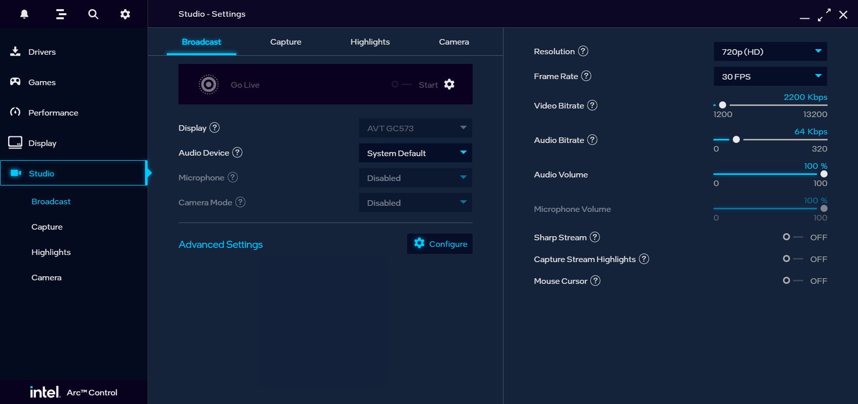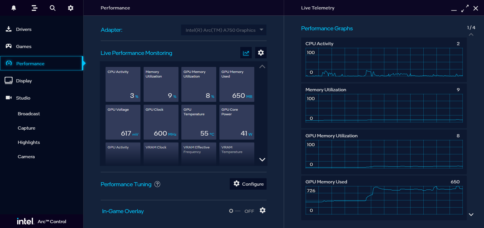 Заводським драйвером Intel передбачено власну панель керування, а також ігровий оверлей. Тут можна обирати рекомендовані налаштування під конкретні ігри. Є функції моніторингу, оверклокінгу, стримінгу, захоплення картинки з екрана (або зовнішньої камери) та класних моментів з ігор (game highlights). Користувач може визначити бітрейт відео, аудіо, фреймрейт, роздільну здатність.