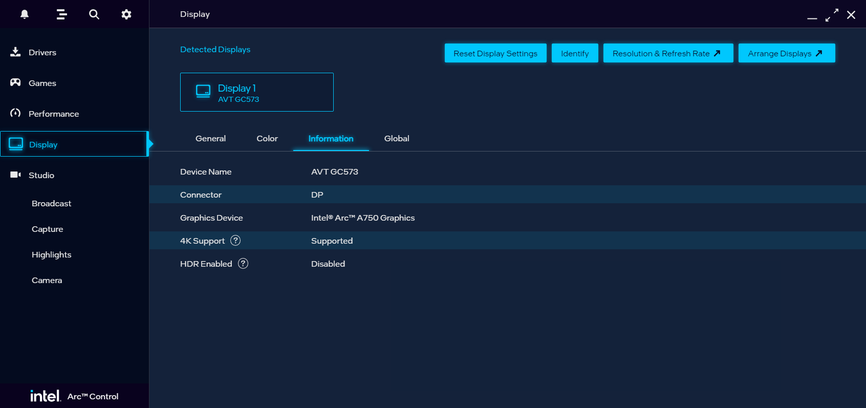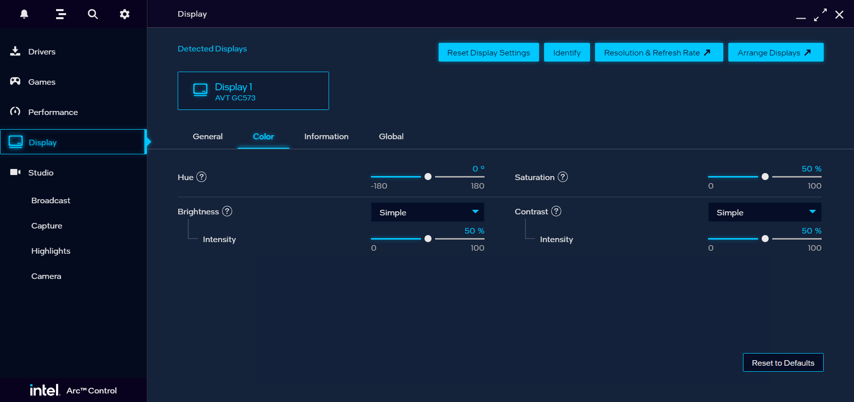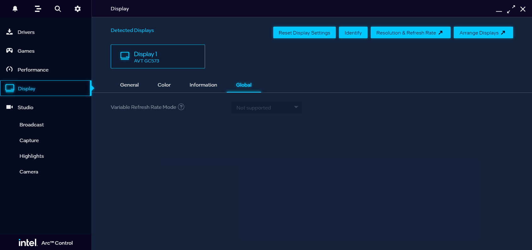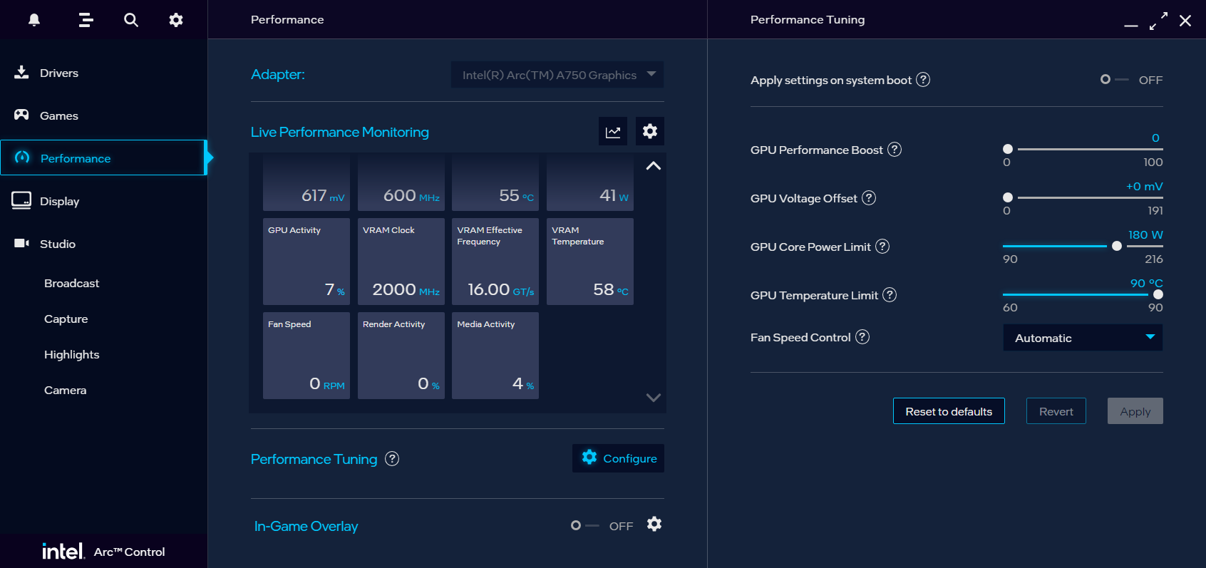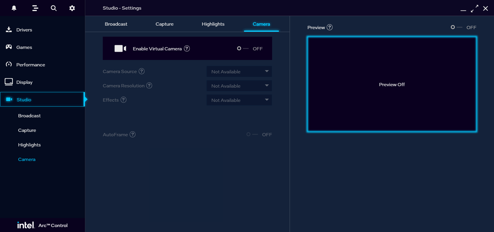 Заводським драйвером Intel передбачено власну панель керування, а також ігровий оверлей. Тут можна обирати рекомендовані налаштування під конкретні ігри. Є функції моніторингу, оверклокінгу, стримінгу, захоплення картинки з екрана (або зовнішньої камери) та класних моментів з ігор (game highlights). Користувач може визначити бітрейт відео, аудіо, фреймрейт, роздільну здатність.